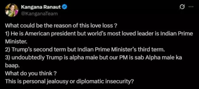 कंगना ने लिखा, “डोनाल्ड ट्रंप अमेरिका के राष्ट्रपति है, लेकिन दुनिया के सबसे लोकप्रिय नेता हमारे प्रधानमंत्री नरेंद्र मोदी है। ट्रंप दूसरी बार राष्ट्रपति बने है, जबकि मोदी जी तीसरी बार।”