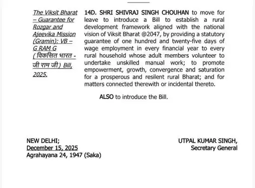 लोकसभा सांसदों को जो बिल सर्कुलेट किया गया है, उसका नाम है ‘विकसित भारत–गारंटी फॉर रोजगार एंड आजीविका मिशन (ग्रामीण) बिल, 2025’ संक्षेप में VB-G RAM G Bill. सरकार का दावा है कि यह कानून ‘विकसित भारत 2047’ के लक्ष्य के अनुरूप ग्रामीण रोजगार की दिशा बदल देगा।