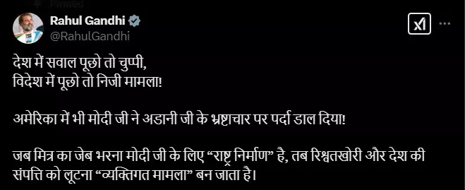 "देश में सवाल पूछो तो चुप्पी, विदेश में पूछो तो निजी मामला! अमेरिका में भी मोदी जी ने अडानी जी के भ्रष्टाचार पर पर्दा डाल दिया। जब मित्र का जेब भरना मोदी जी के लिए “राष्ट्र निर्माण” है, तब रिश्वतखोरी और देश की संपत्ति को लूटना “व्यक्तिगत मामला” बन जाता है।"