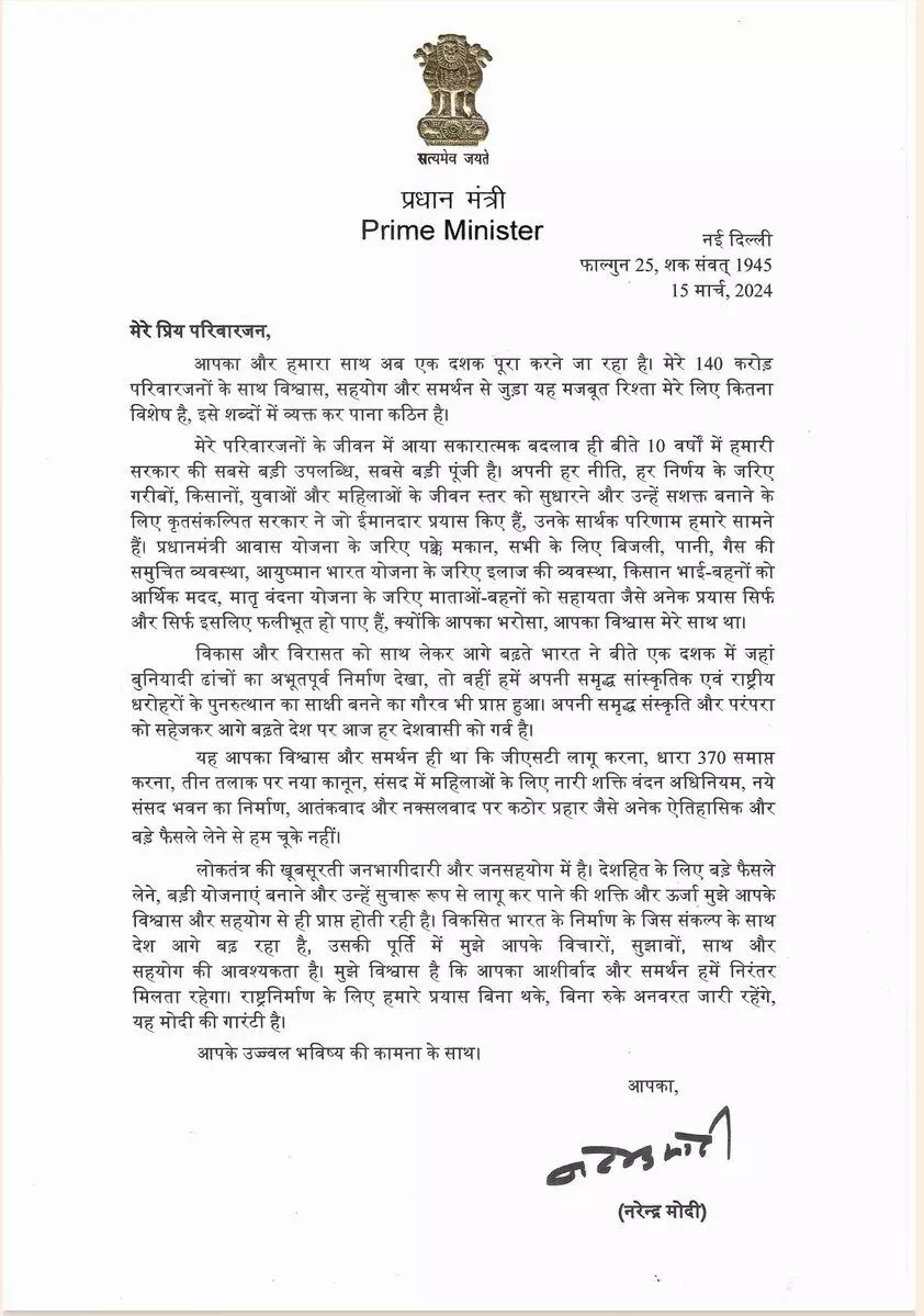 देश में आम चुनाव कार्यक्रम की होने जा रही घोषणा के बीच सामने आए इस पत्र में प्रधानमंत्री नरेन्द्र मोदी ने लिखा, ''लोकतंत्र की खूबसूरती जनभागीदारी और जनसहयोग में है। देशहित के लिए बड़े फैसले लेने, बड़ी योजनाएं बनाने और उन्हें सुचारु रूप से लागू कर पाने की शक्ति और ऊर्जा मुझे आपके विश्वास और सहयोग से ही प्राप्त होती रही है। विकसित भारत के निर्माण के जिस संकल्प के साथ देश आगे बढ़ रहा है, उसकी पूर्ति में मुझे आपके विचारों, सुझावों, साथ और सहयोग की आवश्यकता है। मुझे विश्वास है कि आपका आशीर्वाद और समर्थन हमें निरंतर मिलता रहेगा। राष्ट्र निर्माण के लिए हमारे प्रयास बिना थके, बिना रुके अनवरत जारी रहेंगे, यह मोदी की गारंटी है।'' इस पत्र के आखिर में प्रधानमंत्री नरेन्द्र मोदी सभी के उज्ज्वल भविष्य की कामना करते हुए अपनी कलम को विराम दिया है।