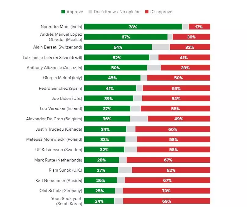 अमेरिकी राष्ट्रपति जो बाइडेन को 39 प्रतिशत, कनाडा के प्रधानमंत्री जस्टिन ट्रूडो को 34 प्रतिशत, यूके के प्रधानमंत्री ऋषि सुनक को 27 प्रतिशत और फ्रांस के राष्ट्रपति इमैनुएल मैक्रॉन को सिर्फ 22 प्रतिशत रेटिंग मिली है।