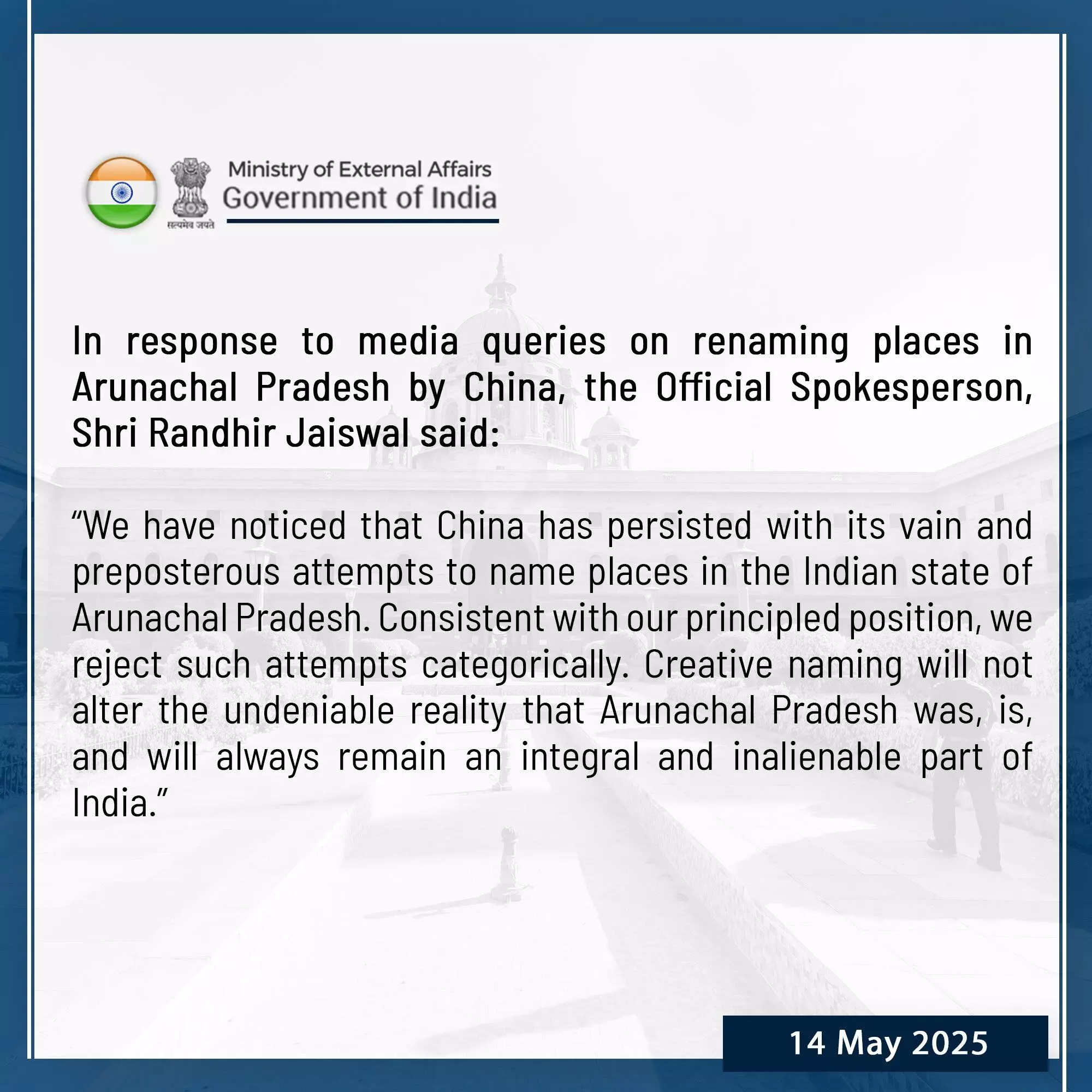 विदेश मंत्रालय के आधिकारिक प्रवक्ता रणधीर जायसवाल ने बुधवार को कहा, "हमने देखा है कि, चीन भारतीय राज्य अरुणाचल प्रदेश में स्थानों के नाम बदलने के अपने व्यर्थ और बेतुके प्रयासों को जारी रखे हुए है। हमारे सैद्धांतिक रुख के अनुरूप, हम इस तरह के प्रयासों को स्पष्ट रूप से अस्वीकार करते हैं।"