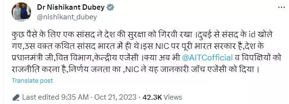 सोशल मीडिया प्लेटफॉर्म एक्स पर निशिकांत दुबे ने लिखा, 'एक सांसद ने चंद पैसों के लिए देश की सुरक्षा को दांव पर लगा दिया। जब सांसद की आईडी को दुबई में खोला गया तो उस वक्त सांसद भारत में ही थीं। इस एनआईसी पर पूरी भारत सरकार है, देश के प्रधानमंत्री, वित्त विभाग, केंद्रीय एजेंसी हैं। क्या अब भी टीएमसी (तृणमूल) और विपक्षियों को राजनीति करनी है। जनता इसका फैसला करेगी। एनआईसी ने इसकी जानकारी जांच एजेंसी को दे दी है।'