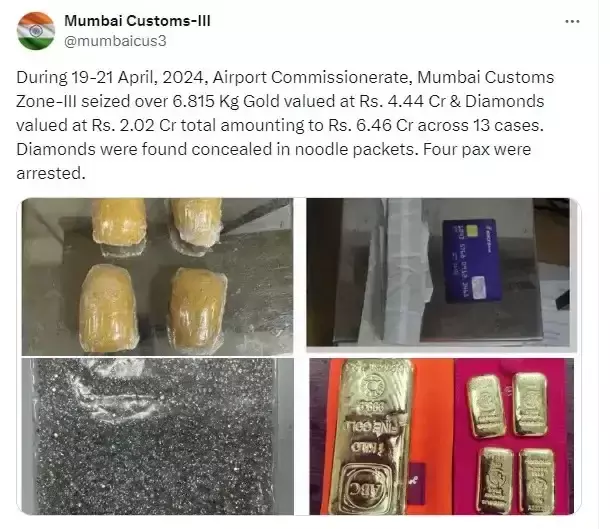 सीमा शुल्क विभाग के सूत्रों के मुताबिक पिछले तीन दिनों तक मुंबई एयरपोर्ट पर विशेष जांच मुहिम चलाई गई थी। इस दौरान 13 मामलों में कुल लगभग 6.815 किलोग्राम सोना जब्त किया गया, जिसकी कीमत अंतराष्ट्रीय बाजार में 4.44 करोड़ रुपये आंकी गई है। इसके साथ ही 2.02 करोड़ रुपये का हीरा भी जब्त किया गया है।