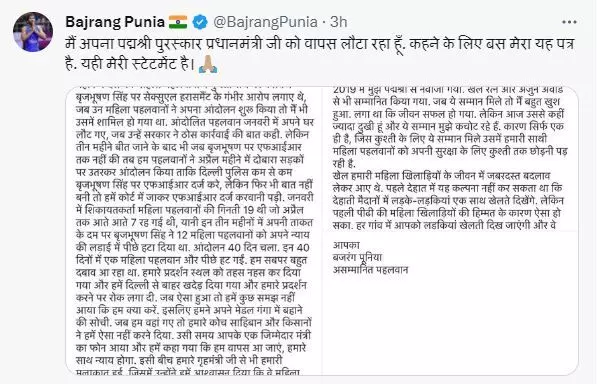 पहलवान बजरंग पुनिया ने पद्मश्री लौटाने का किया ऐलान, प्रधानमंत्री मोदी को लिखा पत्र