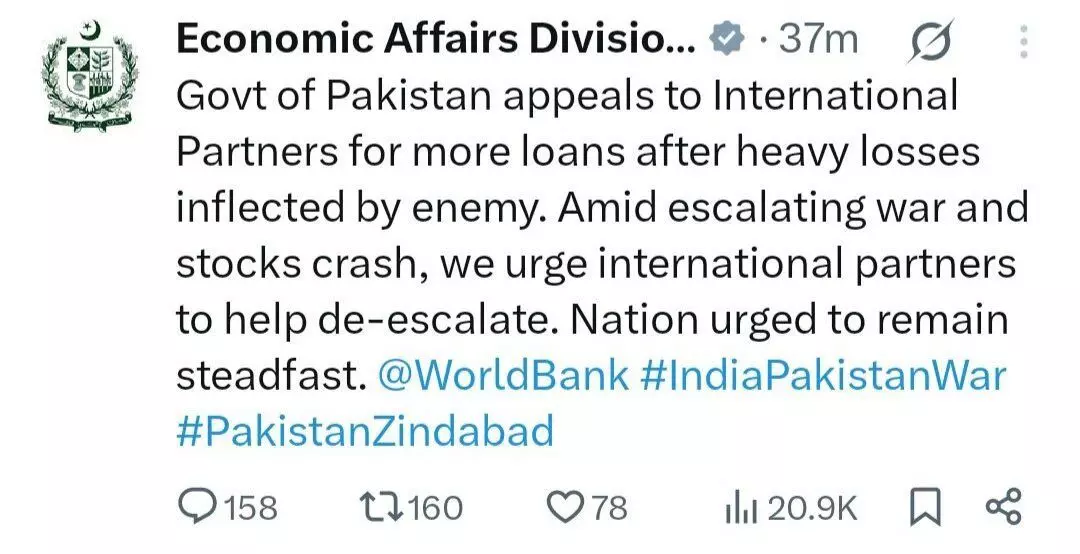 पाकिस्तान के आर्थिक मामलों के मंत्रालय के आधिकारिक अकाउंट से ट्वीट किया कि, "पाकिस्तान सरकार ने दुश्मन द्वारा किए गए भारी नुकसान के बाद अंतर्राष्ट्रीय भागीदारों से अधिक ऋण के लिए अपील की है। बढ़ते युद्ध और स्टॉक क्रैश के बीच, हम अंतर्राष्ट्रीय भागीदारों से तनाव कम करने में मदद करने का आग्रह करते हैं।"