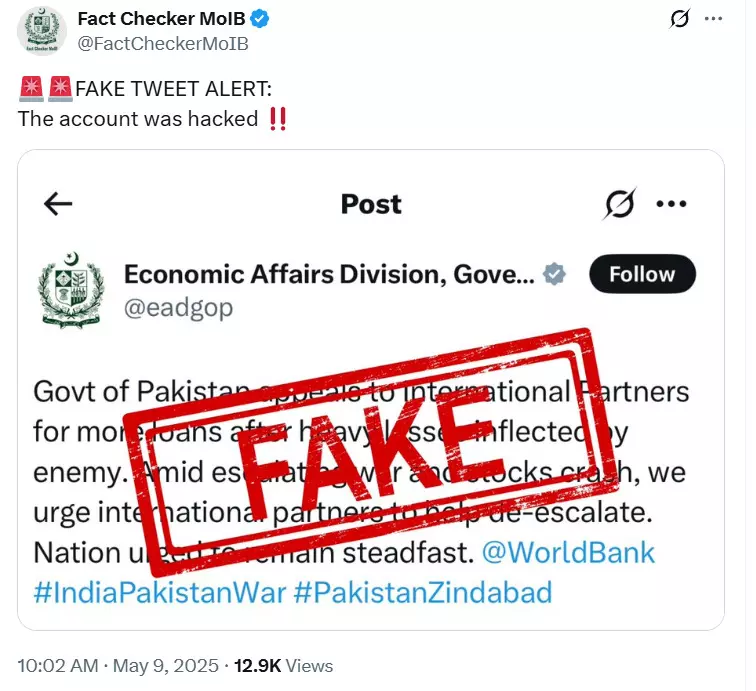 इस ट्वीट को लेकर सोशल मीडिया पर चर्चा के बीच पाकिस्तान के सूचना एवं प्रसारण मंत्रालय का दावा है कि सरकार के आर्थिक मामलों के मंत्रालय, आर्थिक मामलों के प्रभाग का 'एक्स' अकाउंट हैक कर लिया गया है। पाकिस्तान के सूचना एवं प्रसारण मंत्रालय ने फैक्ट चेक में इस दावे को गलत बताया है।