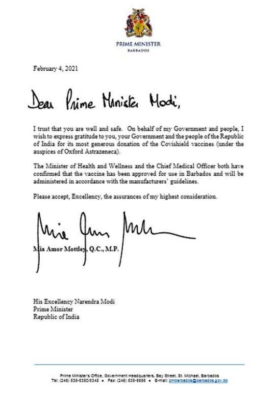 बर्बाडोस की प्रधानमंत्री मिया अमोर मॉटले ने भारत के प्रधानमंत्री नरेन्द्र मोदी को पत्र लिखकर कोरोना वैक्सीन की खेप उपलब्ध कराने के लिए धन्यवाद दिया है। प्रधानमंत्री नरेन्द्र मोदी को लिखे गए पत्र में उन्होंने कहा है कि 'मुझे विश्वास है कि आप सभी स्वास्थ और सुरक्षित होंगे। बर्बाडोस की जनता और सरकार की ओर से वह भारत सरकार और भारत के लोगों को भारत की कोवीशील्ड वैक्सीन की खेप उपलब्ध कराने के लिए धन्यवाद देते हैं।