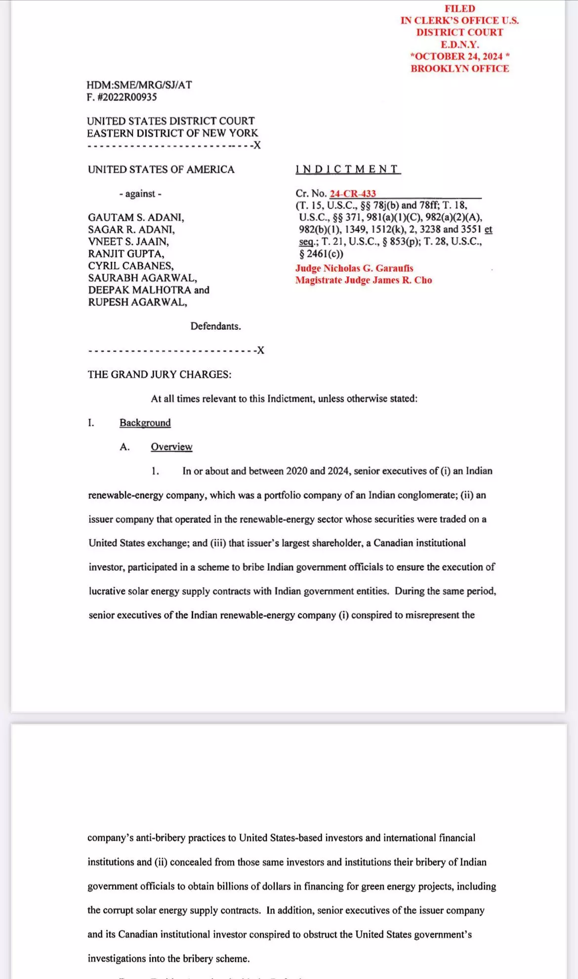 आरोप पत्र में कहा गया है कि, "भारतीय सरकारी अधिकारियों को रिश्वत देने के वादे के बाद, जुलाई 2021 से फरवरी 2022 के बीच ओडिशा, जम्मू - कश्मीर, तमिलनाडु, छत्तीसगढ़ और आंध्र प्रदेश के राज्यों और क्षेत्रों की बिजली वितरण कंपनियों ने मैन्युफैक्चरिंग लिंक्ड प्रोजेक्ट के तहत SECI के साथ PSA में प्रवेश किया। आंध्र प्रदेश की बिजली वितरण कंपनियों ने 1 दिसंबर, 2021 को या उसके आसपास SECI के साथ एक PSA में प्रवेश किया, जिसके अनुसार राज्य ने लगभग सात गीगावाट सौर ऊर्जा खरीदने पर सहमति व्यक्त की - जो किसी भी भारतीय राज्य या क्षेत्र की तुलना में अब तक की सबसे बड़ी राशि है।"
