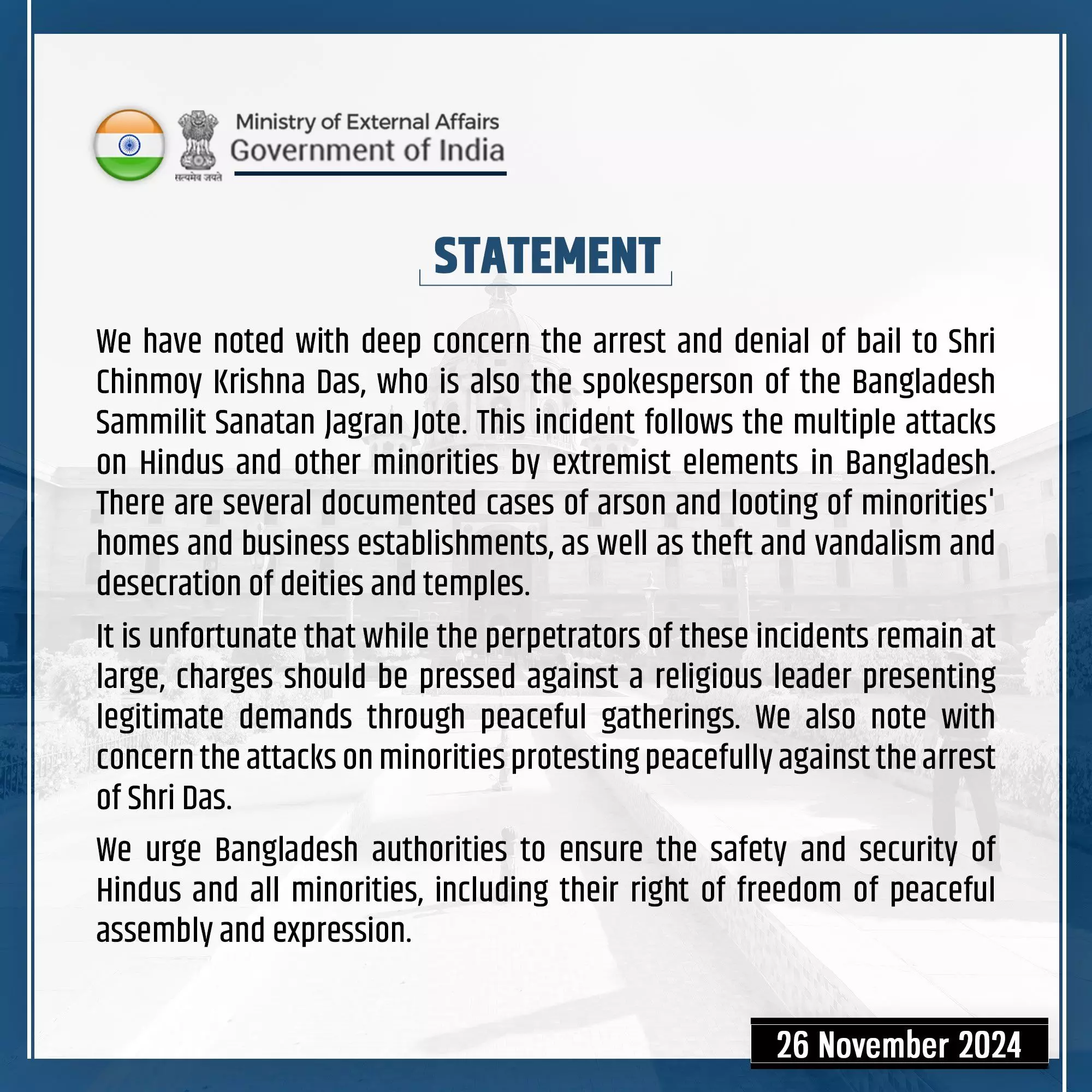 हम श्री चिन्मय कृष्ण दास की गिरफ्तारी और जमानत से इनकार करने पर गहरी चिंता व्यक्त करते हैं, जो बांग्लादेश सम्मिलित सनातन जागरण जोत के प्रवक्ता भी हैं। यह घटना बांग्लादेश में चरमपंथी तत्वों द्वारा हिंदुओं और अन्य अल्पसंख्यकों पर कई हमलों के बाद हुई है। अल्पसंख्यकों के घरों और व्यापारिक प्रतिष्ठानों में आगजनी और लूटपाट के साथ-साथ चोरी और तोड़फोड़ और देवताओं और मंदिरों को अपवित्र करने के कई मामले सामने आए हैं।