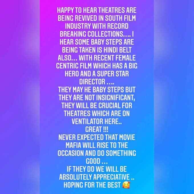 कंगना ने अपनी पोस्ट में लिखा-'यह सुनकर खुशी हुई कि दक्षिण फिल्म उद्योग में सिनेमाघरों को रिकॉर्ड तोड़ संग्रह के साथ पुनर्जीवित किया जा रहा है। मैंने सुना है कि महिला केंद्रित फिल्म, जिसमें एक बड़ा हीरो और एक सुपर स्टार निर्देशक हैं, उसके साथ हिंदी पट्टी में भी कुछ छोटे कदम उठाए जा रहे हैं। यह छोटे कदम हो सकते हैं, लेकिन महत्वहीन नहीं हो सकते।यह उन सिनेमाघरों के लिए महत्वपूर्ण होंगे, जो वेंटिलेटर पर हैं। गजब है! कभी उम्मीद नहीं थी कि फिल्म माफिया इस अवसर पर उठेंगे और कुछ अच्छा करेंगे। यदि वे ऐसा करते हैं, तो हम उनकी सराहना करेंगे। सर्वश्रेष्ठ की आशा करते हैं।'