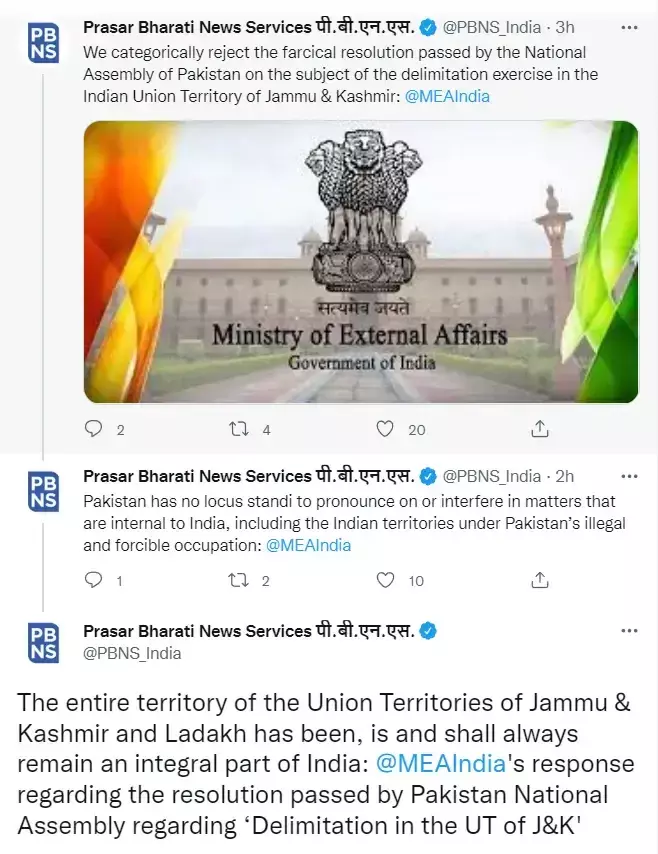 विदेश मंत्रालय के प्रवक्ता अरिंदम बागची ने कहा, "हम केंद्र शासित प्रदेश जम्मू और कश्मीर में परिसीमन अभ्यास के विषय पर पाकिस्तान की संसद द्वारा पारित हास्यास्पद प्रस्ताव को स्पष्ट रूप से अस्वीकार करते हैं। पाकिस्तान के पास अवैध और जबरन कब्जे वाले भारतीय क्षेत्रों सहित हमारे आंतरिक मामलों में निर्णय लेने या हस्तक्षेप करने का कोई अधिकार नहीं है।"