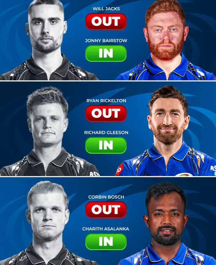 शानदार बल्लेबाजी करने वाले रेयान रिकॉल्टन की जगह इंग्लैंड के तेज गेंदबाज रिचर्ड ग्लीसन (Richard Gleeson) को मौका मिला है। रिकॉल्टन ने इस सीजन में 12 पारियों में 336 रन बनाए थे। वे टीम के अहम बल्लेबाज बनकर उभरे। इसके अलावा ऑलराउंडर कॉर्बिन बॉश की जगह श्रीलंका के सीमित ओवरों के कप्तान चरिथ असलंका (Charith Aslanka )को शामिल किया गया है। अब ये तीनों खिलाड़ी मुंबई इंडियंस के लिए जीत का रास्ता बना सकते हैं।