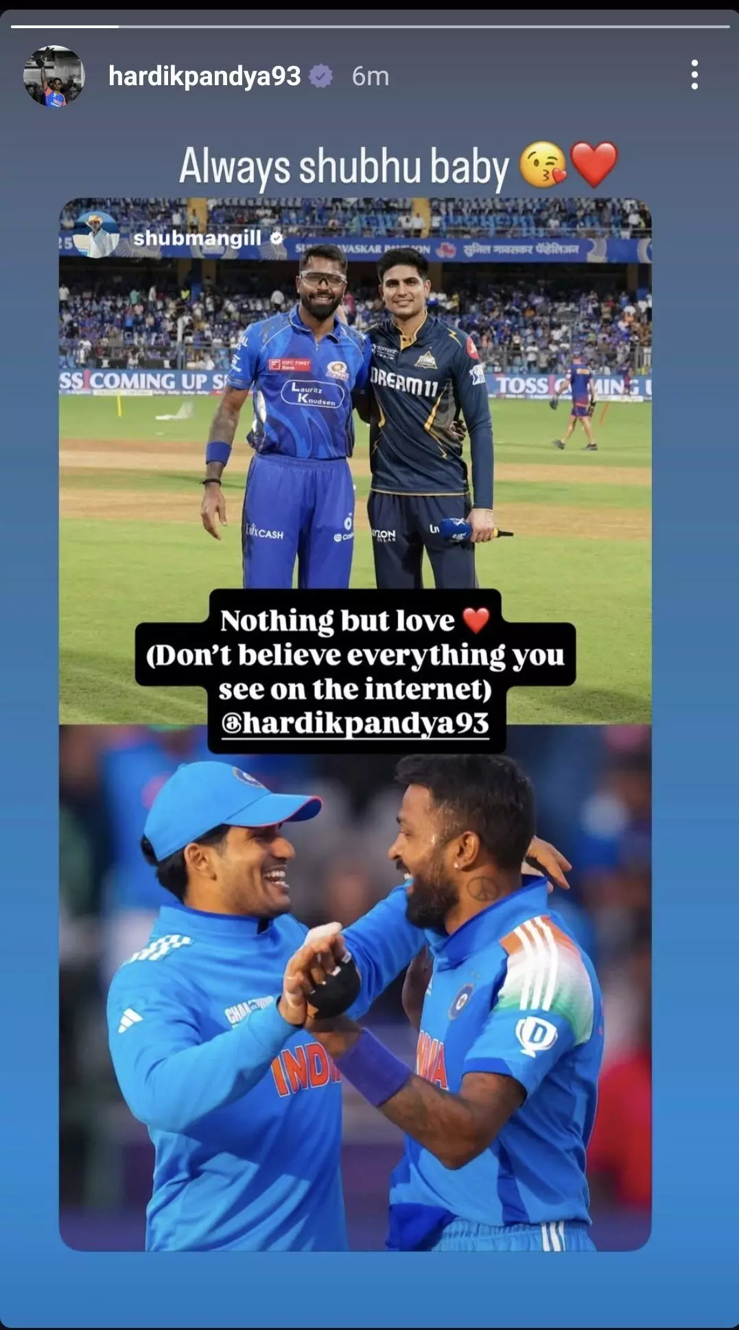 शुभमन गिल ने हार्दिक पांड्या के साथ विवाद की अफवाहों को पूरी तरह से खारिज करते हुए इंस्टाग्राम पर एक स्टोरी शेयर की है। इसमें उन्होंने हार्दिक के साथ एक पुरानी फोटो पोस्ट की । कैप्शन में लिखा, "प्यार के अलावा कुछ नहीं। इंटरनेट पर आने वाली हर बात पर यकीन मत करो।" गिल ने इस पोस्ट में हार्दिक को भी टैग किया, जिससे साफ हो गया कि दोनों के बीच कोई तनाव नहीं है। उनकी दोस्ती पहले की तरह मजबूत बनी हुई है।