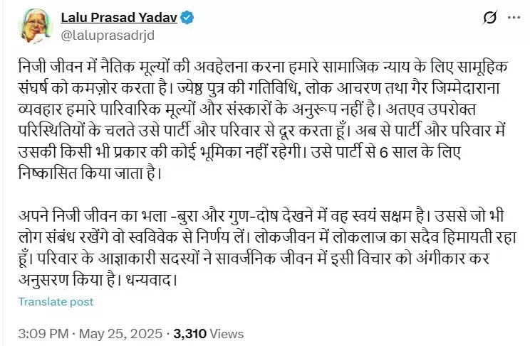 लालू यादव ने अपने बयान में कहा, "निजी जीवन में नैतिक मूल्यों की अवहेलना करना हमारे सामाजिक न्याय के संघर्ष को कमजोर करता है। तेजप्रताप की गतिविधियां, लोक आचरण, और गैर-जिम्मेदाराना व्यवहार हमारे पारिवारिक मूल्यों और संस्कारों के अनुरूप नहीं हैं।"