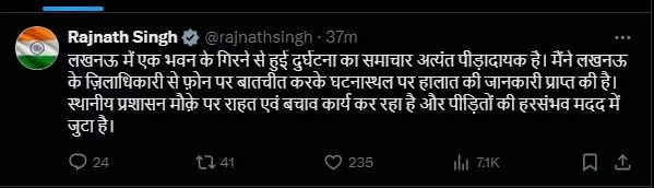 केंद्रीय रक्षा मंत्री राजनाथ सिंह (Rajnath Singh) ने सोशल मीडिया प्लेटफॉर्म 'X' पर पोस्ट करते हुए लिखा, "लखनऊ में भवन के गिरने से हुई दुर्घटना का समाचार अत्यंत पीड़ादायक है। मैंने लखनऊ के ज़िलाधिकारी से फ़ोन पर बातचीत करके घटनास्थल पर हालात की जानकारी प्राप्त की है। स्थानीय प्रशासन मौक़े पर राहत एवं बचाव कार्य कर रहा है और पीड़ितों की हरसंभव मदद में जुटा है।