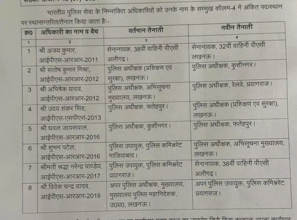 जारी आदेश के अनुसार, अजय कुमार, 32 वाहिनी PAC के कमांडेंट, संतोष कुमार मिश्रा SP कुशीनगर, अभिषेक यादव SP रेलवे प्रयागराज, उदय शंकर सिंह SP फतेहपुर के पद से हटाकर प्रशिक्षण एवं सुरक्षा मुख्यालय भेजे गए। वहीं धवल जयसवाल क़ो SP फतेहपुर बनाया गया है। शुभम पटेल क़ो SP अभिसूचना मुख्यालय लखनऊ भेजा गया। श्रद्धा नरेन्द्र पाण्डेय क़ो 38वी वाहिनी PAC अलीगढ का कमांडेंट बनाया गया।