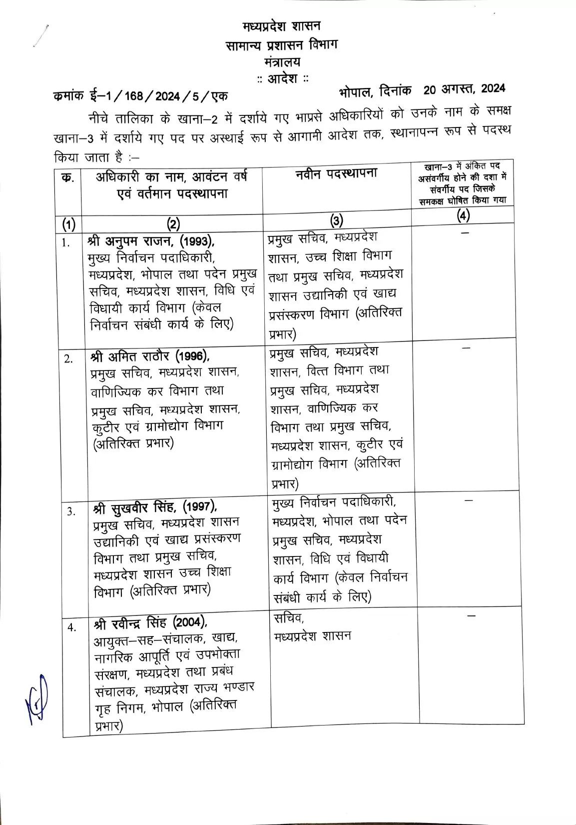 |MP IAS Transfer : मध्यप्रदेश। सामान्य प्रशासन विभाग द्वारा भारतीय प्रशासनिक सेवा के अधिकारियों की नवीन पदस्थापना के आदेश जारी किये गए हैं। इस आदेश के अनुसार 9 अधिकारियों को नई जिम्मेदारी दी गई है। इस सूची में सबसे पहला नाम मुख्य निर्वाचन पदाधिकारी अनुपम राजन का है। वे अब तक मुख्य निर्वाचन पदाधिकारी की जिम्मेदारी निभा रहे थे। नवीन आदेश के अनुसार अब वे राज्य सरकार के उच्च शिक्षा विभाग में प्रमुख सचिव का कार्यभार संभालेंगे। इसके अलावा अनुपम राजन को उद्यानिकी और खाद्य प्रसंस्करण विभाग की जिम्म्मेदारी भी दी गई हैं।