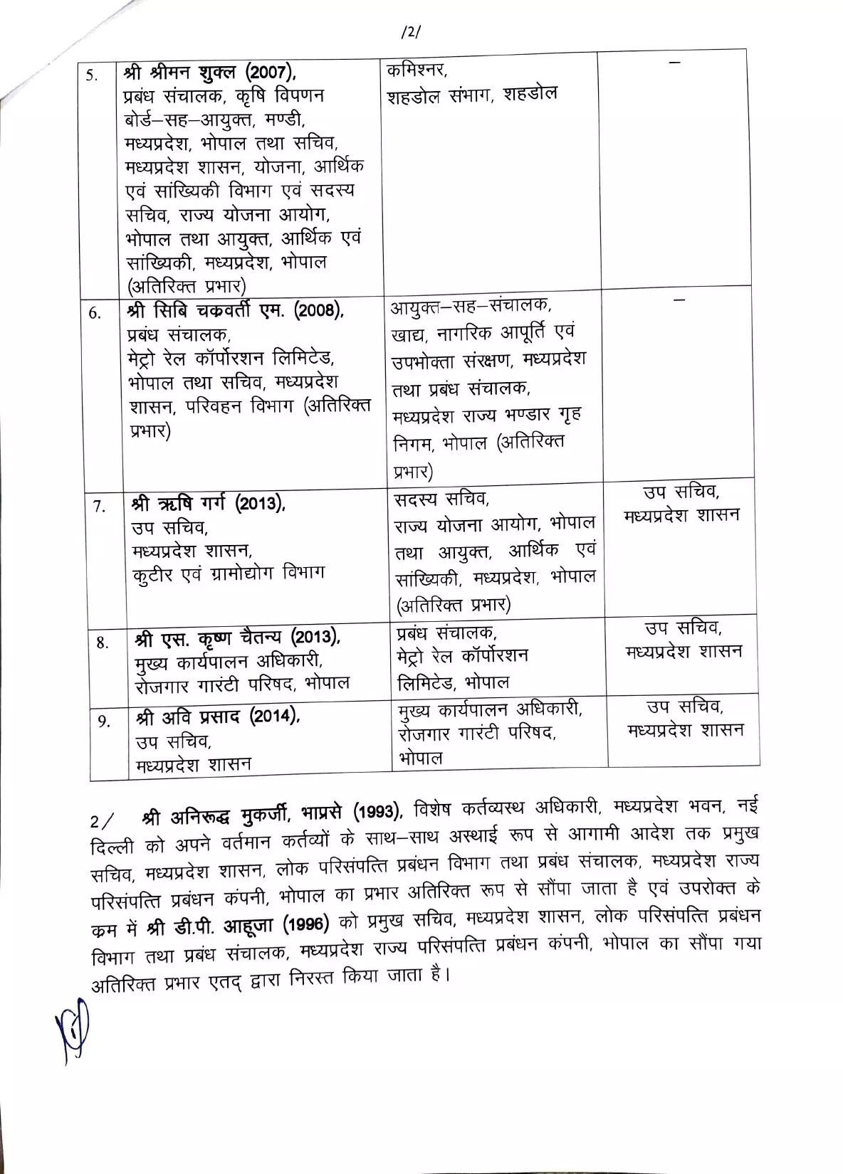 1997 बैच के अधिकारी सुखवीर सिंह जो अब तक उद्यानिकी और खाद्य प्रसंस्करण विभाग के प्रमुख सचिव थे, उन्हें मध्यप्रदेश का मुख्य निर्वाचन पदाधिकारी बना दिया गया है। वहीं 2007 बैच के श्रीमन शुक्ल को शहडोल संभाग का कमिश्नर बना दिया गया है।