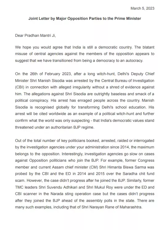 "आदरणीय प्रधानमंत्रीजी, हमें भरोसा है कि आपको आज भी लगता है कि भारत एक लोकतांत्रिक देश है। विपक्षी नेताओं के खिलाफ केंद्रीय एजेंसियों का मनमाना इस्तेमाल यह दिखाता है कि हम एक लोकतंत्र से तानाशाही में तब्दील हो गए हैं। लंबी तलाश के बाद 26 फरवरी 2023 को मनीष सिसोदिया को CBI ने गिरफ्तार कर लिया। कथित तौर पर गड़बड़ी के आरोप में ये गिरफ्तारी की गई और वह भी बिना कोई सबूत दिखाए।