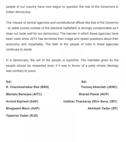 पीएम को चिट्ठी लिखने वालों में अरविंद केजरीवाल (आप), के. चंद्रशेखर राव (बीआरएस), ममता बनर्जी (तृणमूल कांगेस), भगवंत मान (आप), तेजस्वी यादव (राजद), फारूक अब्दुल्ला (जेकेएनसी), शरद पवार (एनसीपी), उद्धव ठाकरे (शिवसेना, यूबीटी), अखिलेश यादव (सपा) का नाम शामिल है।
