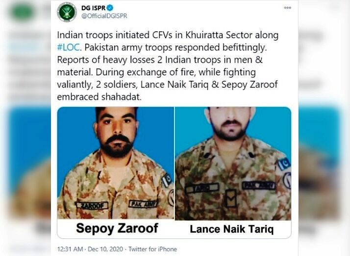 पाकिस्तानी सेना के प्रवक्ता ने भी अपने ट्विटर हैंडल @OfficialDGISPR से भारत की जवाबी कार्यवाही में एलओसी के साथ खुरीरत्ता सेक्टर में दो पाकिस्तानी सैनिकों के मारे जाने की पुष्टि की है। भारत की गोली का शिकार हुए जवानों के नाम लांस नायक तारिक और सिपाही जरौफ बताये गए हैं। इसके अलावा पाकिस्तान डिफेन्स नाम के ट्विटर हैंडल @Defence__Pk से ट्विट में पुष्टि की गई है कि भारत की गोलाबारी से पाकिस्तान के सेक्टर ताई पाणी और सहरा सेक्टर में ताई निवासी एक महिला नसीम फातिमा, विधवा साबिर हुसैन शाह घायल हो गए, जबकि कई घर और एक मस्जिद भी क्षतिग्रस्त हो गए। एलओसी के दारा शेर खान और सेहरा इलाके में बिजली काट दी गई है।