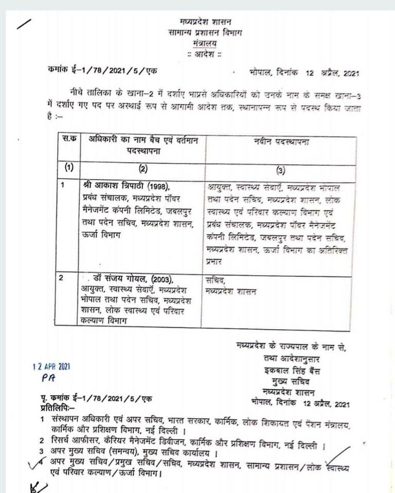 राज्य सरकार ने आज इस संबंध में आदेश जारी कर दिए है। जिसके बाद मप्र पॉवर मैनेजमेंट कंपनी में प्रबंध संचालक का पद संभाल रहे आकाश त्रिपाठी को स्वास्थ्य आयुक्त की जिम्मेदारी सौंपी गई है। वहीँ संजय गोयल सचिव मप्र शासन के पद पर नविन पदस्थापना की गई गई।
