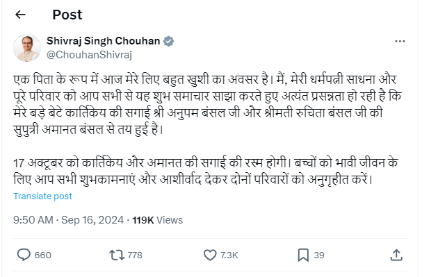 आपको बता दें कि कुछ महीने पहले ही शिवराज सिंह चौहान के छोटे बेटे कुणाल सिंह चौहान की भी सगाई हुई है। कुणाल का रिश्ता भोपाल के डॉक्टर इंद्रमल जैन की पोती रिद्धि जैन के साथ तय हुआ है।