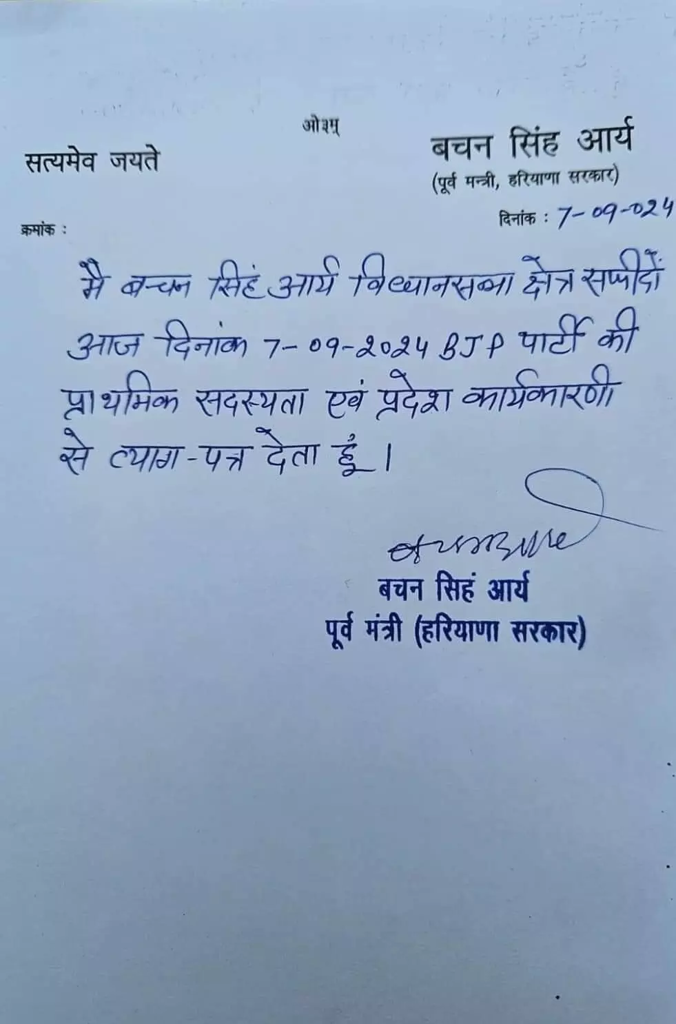 |Bachan Singh Arya Resigned From BJP : हरियाणा। भाजपा नेता और हरियाणा के पूर्व मंत्री बचन सिंह आर्य ने पार्टी से इस्तीफा दे दिया। इस तरह भाजपा हरियाणा में इस्तीफे का दौर जारी है। बच्चन सिंह आर्य ने चार लाइन का इस्तीफा लिखा है। उन्होंने पार्टी की प्राथमिक सदस्यता के साथ - साथ भाजपा कार्यकारिणी से भी इस्तीफा दे दिया है।