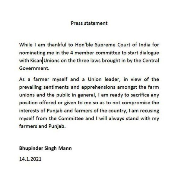 उन्होंने अपने एक वक्तवय में कमेटी में शामिल किये जाने के लिए धन्यवाद देते हुए कहा की मैं केंद्र सरकार द्वारा लाए गए तीन कानूनों पर किसान यूनियनों के साथ बातचीत शुरू करने के लिए गठित समिति का सदस्य बनाने के लिए भारत के माननीय सर्वोच्च न्यायालय का आभारी हूं।उन्होंने आगे कहा की मैं किसानों के हितों से समझौता नहीं कर सकता इसलिए कमेटी से हट रहा हूँ और पंजाब एवं किसानों के साथ सदा खड़ा रहूंगा।