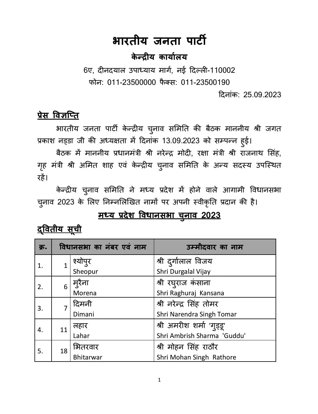 मप्र चुनाव : भाजपा ने दूसरी सूची जारी की, दिमनी से केंद्रीय मंत्री नरेंद्र सिंह तोमर को दिया टिकट