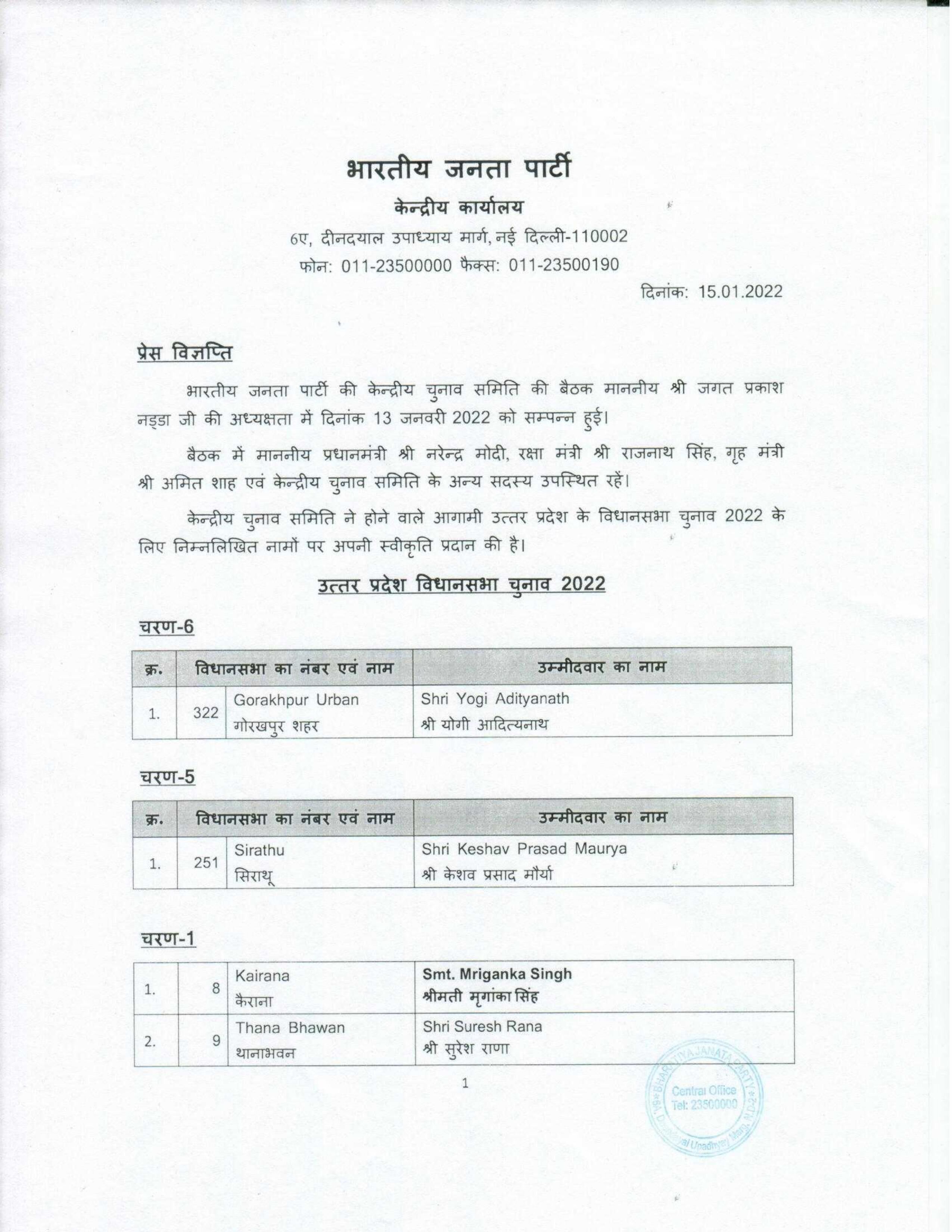 |नईदिल्ली/लखनऊ। उत्तरप्रदेश विधानसभा चुनाव के लिए भाजपा ने पहल और दूसरे चरण के लिए उम्मीदवारों के नाम का ऐलान कर दिया है। भाजपा मुख्यलय में आयोजित प्रेस वार्ता को केंद्रीय मंत्री धर्मेंद्र प्रधान और भाजपा के राष्ट्रीय महासचिव अरुण सिंह संबोधित कर रहे हैं। योगी आदित्यनाथ गोरखपुर शहर से और केशव प्रसाद मौर्य सिराथू से उम्मीदवार होंगे। पहले कहा जा रहा था कि योगी अयोध्या से लडेंगे लेकिन ऐन समय पर पार्टी ने उन्हें गोरखपुर से ही उम्मीदवार बनाया है।