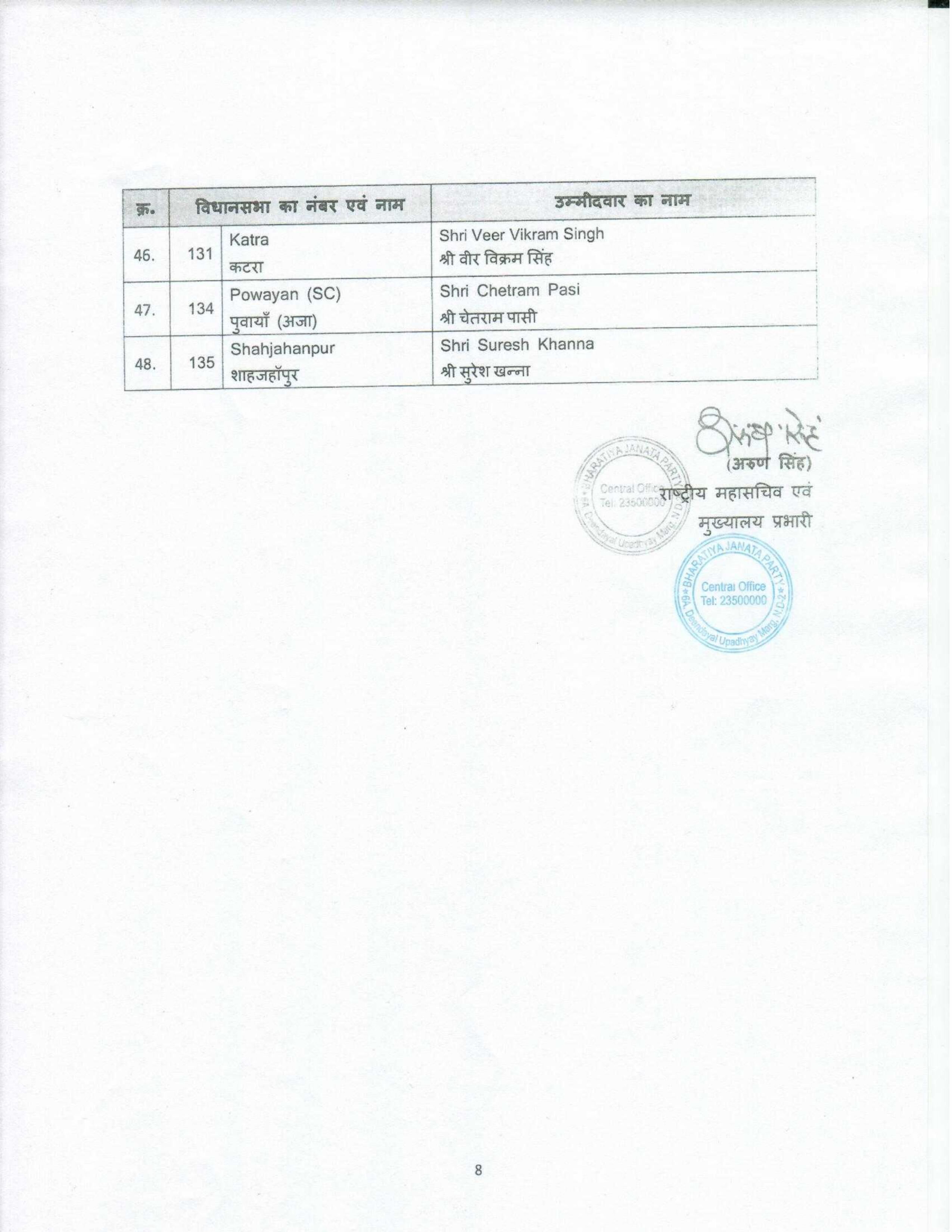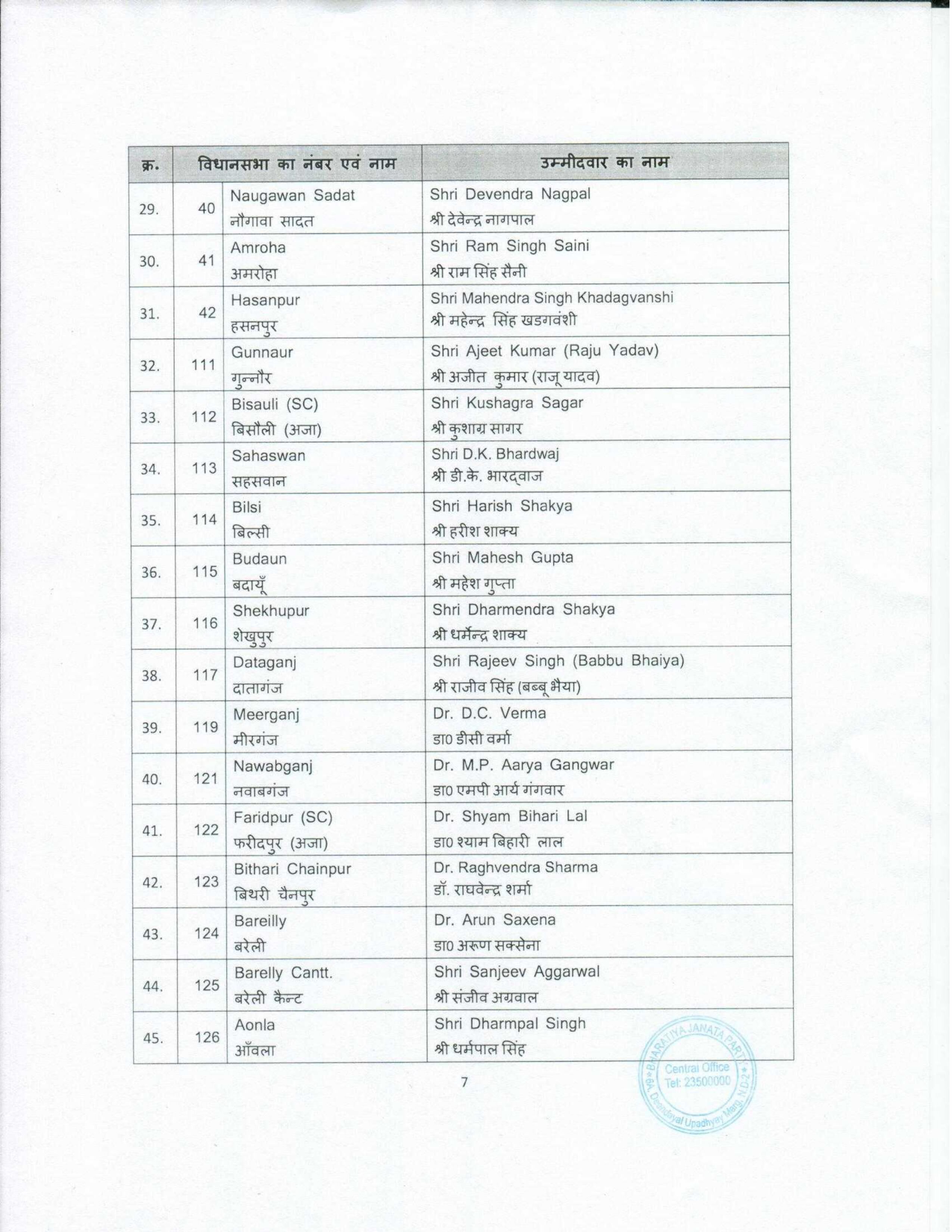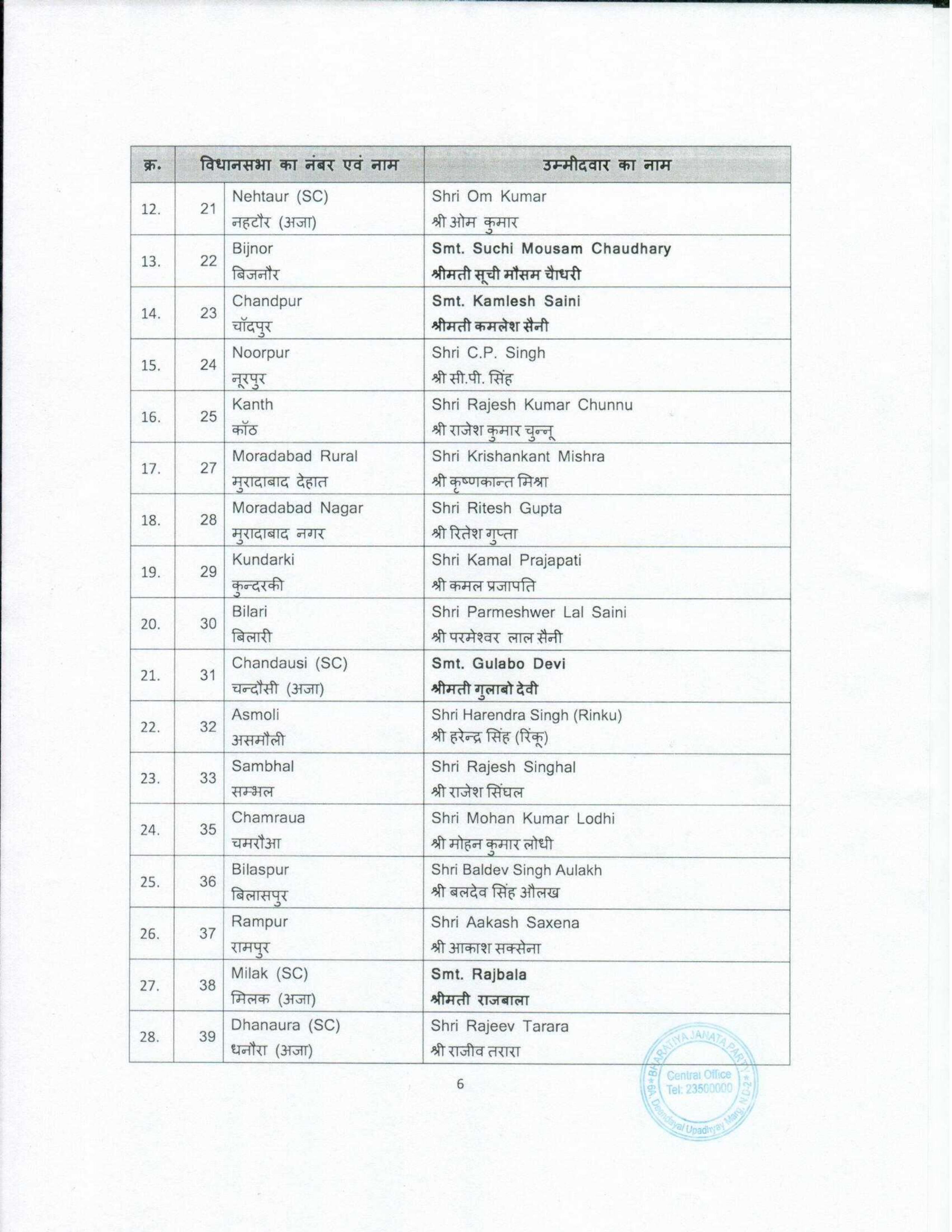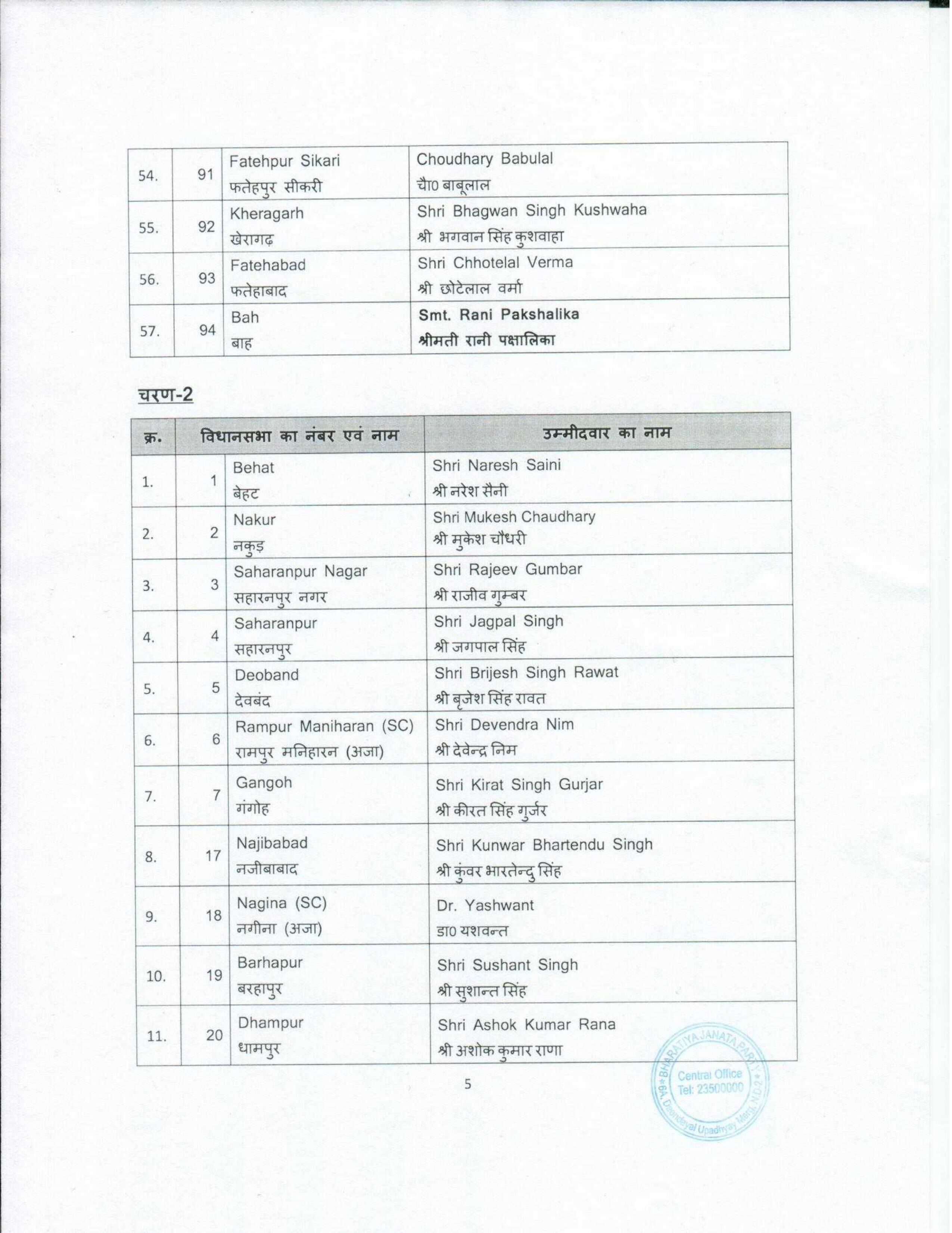 इस सूची में पहले चरण की 58 में से 57 और दूसरे चरण की 55 में से 48 सीटों पर उम्मीदवारों के नाम शामिल हैं।पहले चरण में पश्चिमी उत्तर प्रदेश के 11 जिलों की 58 सीटों पर मतदान होना है। इसमें गाजियाबाद, मेरठ, मुजफ्फरनगर, शामली, बागपत, हापुड़, बुलंदशहर, मथुरा, आगरा और अलीगढ़ शामिल हैं।वहीं, दूसरे चरण का मतदान 14 फरवरी को होगा । इसके लिये 21 जनवरी को अधिसूचना जारी की जायेगी और 28 जनवरी को नामांकन की अंतिम तिथि तय है। नाम वापसी की अंतिम तारीख 31 जनवरी है।दूसरे चरण में राज्य के नौ जिलों की 55 सीटों पर मतदान होना है। इसमें बिजनौर, सहारनपुर, संभल, अमरोहा, मुरादाबाद, बरेली, बदायूं और शाहजहांपुर जिले शामिल हैं।