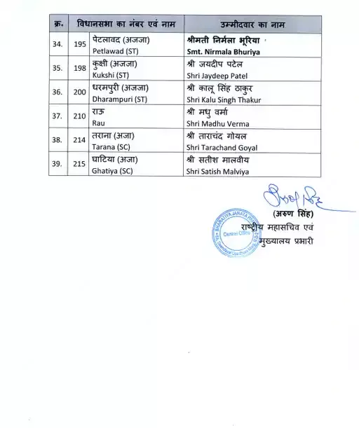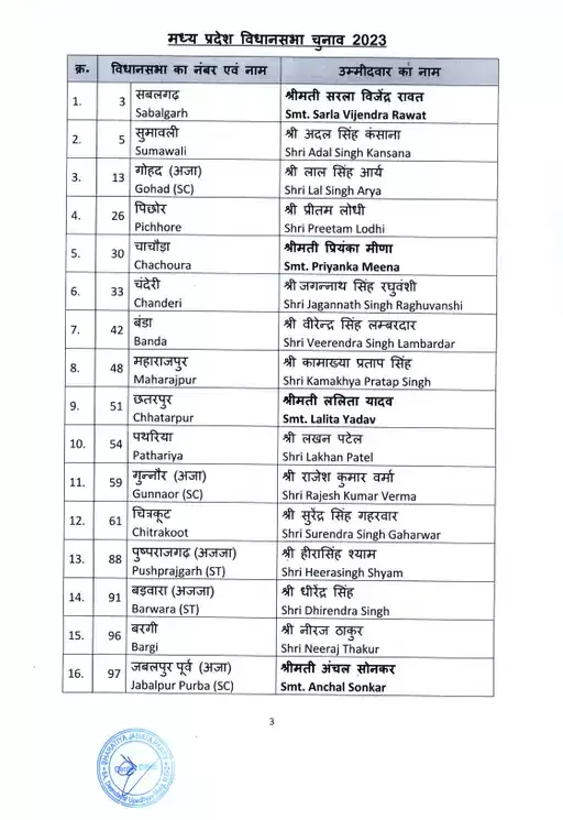 पार्टी ने भोपाल मध्य से ध्रुवनारायण सिंह और भोपाल उत्तर से आलोक शर्मा को टिकट दिया गया है। भिंड के गोहद से लाल सिंह आर्य को टिकट दिया गया है। जबकि पिछोर सीट से प्रीतम लोधी को मैदान में उतारा गया। पार्टी ने पांच सीटों पर महिला उम्मीदवारों के नाम का ऐलान किया है। जिसमें सरला विजेंद्र रावत (सबलगढ़), प्रियंका मीणा (चाचौड़ा), ललिता यादव (छतरपुर), अंचल सोनकर (जबलपुर पूर्व), निर्मला भूरिया (पेटलावाद), को उम्मीदवार बनाया है।