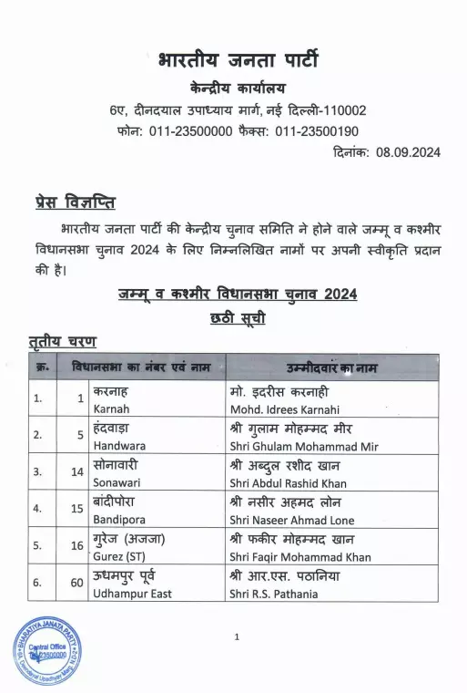 BJP Candidate List: जम्मू-कश्मीर विधानसभा चुनाव के लिए भाजपा ने जारी की 6 उम्मीदवारों की सूची