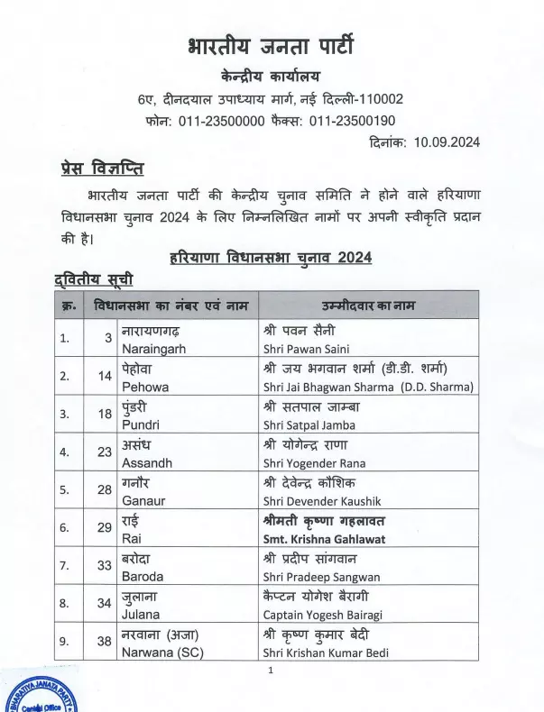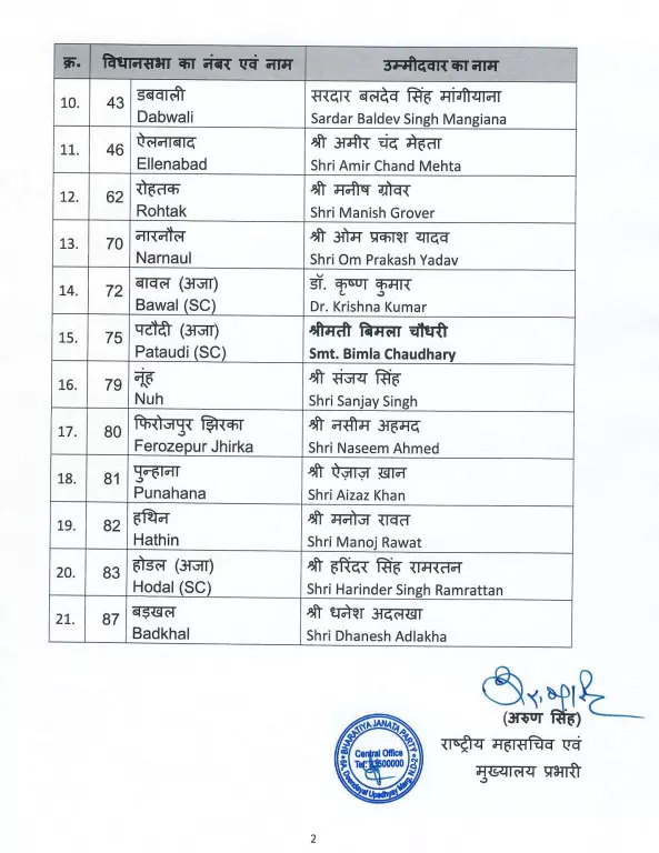 |BJP candidate list : हरियाणा चुनाव। भाजपा ने 21 उम्मीदवारों की दूसरी सूची जारी की। इसके अनुसार प्रदीप सांगवान बड़ौदा से चुनाव लड़ेंगे। जुलान से भाजपा ने कैप्टन योगेश बैरागी को उम्मीदवार बनाया है। इस सीट से कांग्रेस ने विनेश फोगाट को उम्मीदवार बनाया है।