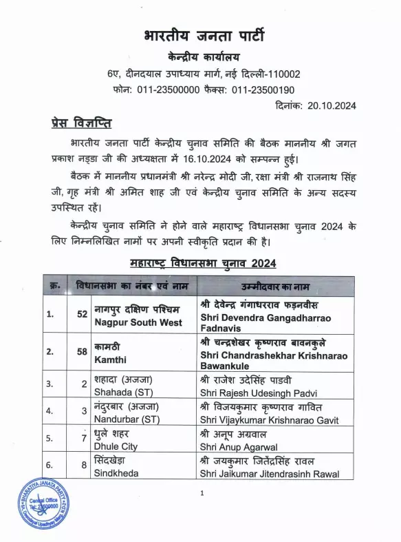 Maharashtra BJP Candidates List: महाराष्ट्र में BJP ने जारी की 99 प्रत्याशियों पहली लिस्ट, नागपुर साउथ वेस्ट से देवेंद्र फडणवीस को टिकट