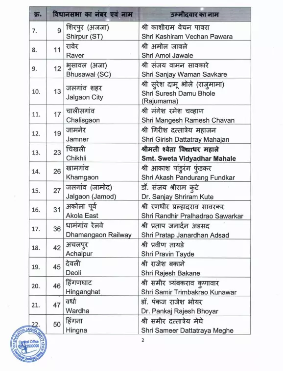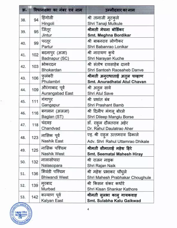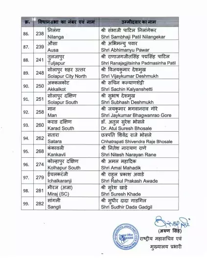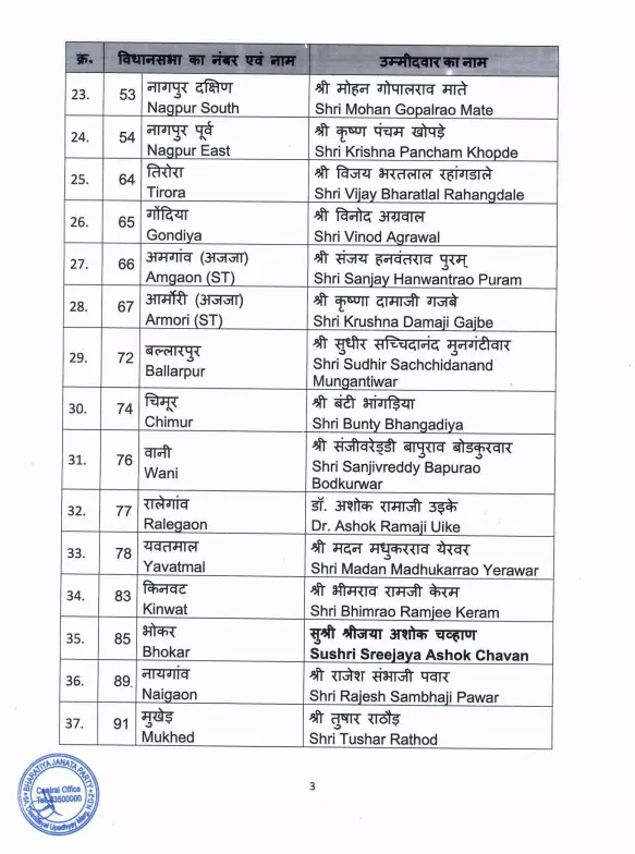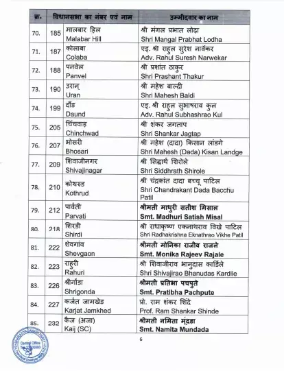 बीजेपी ने महाराष्ट्र के विधानसभा चुनाव में मंत्री गिरीश महाजन जामनेर से, मंत्री सुधीर मुनगंटीवार बल्लारपुर से, श्रीजया अशोक चव्हाण भोकर से, आशीष शेलार वांड्रे वेस्ट से, मंगल प्रभात लोढ़ा मालाबार हिल से, कोलाबा से राहुल नार्वेकर और सतारा से छत्रपति शिवेंद्र राजे भोसले को उम्मीदवार बनाया है।
