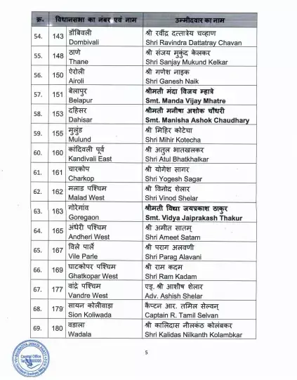 रिपोर्ट्स के मुताबिक बीजेपी की पहली लिस्ट में मुंबई के तीन मौजूदा विधायकों पराग शाह (घाटकोपर पूर्व), भारती लवेकर (वर्सोवा), सुनील राणे (बोरीवली) के नाम शामिल नहीं है। अब कयास लगाए जा रहे हैं कि उनकी सीट बदलने की संभावना है। बीजेपी द्वारा जारी की गई लिस्ट में 6 सीटें एसटी और 4 सीटें एससी के लिए हैं। वहीं, 13 सीटों पर महिलाओं को टिकट दिया है।