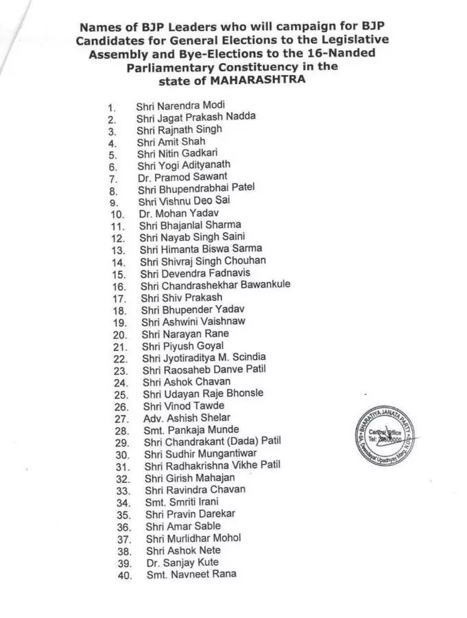 |BJP Star Campaigner List for Maharashtra Elections : महाराष्ट्र। भारतीय जनता पार्टी ने महराष्ट्र में होने वाले विधानसभा चुनाव के लिए स्टार प्रचारकों की लिस्ट जारी कर दी है। इस लिस्ट में पीएम मोदी, केंद्रीय मंत्री जेपी नड्डा, अमित शाह, राजनाथ सिंह, नितिन गडकरी, शिवराज सिंह चौहान, असम के मुख्यमंत्री हिमंत बिस्वा सरमा, यूपी के मुख्यमंत्री योगी आदित्यनाथ समेत 40 नेताओं के नाम शामिल हैं।