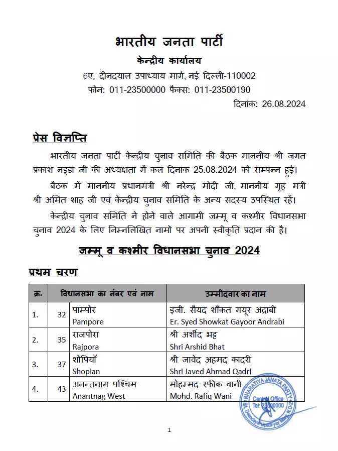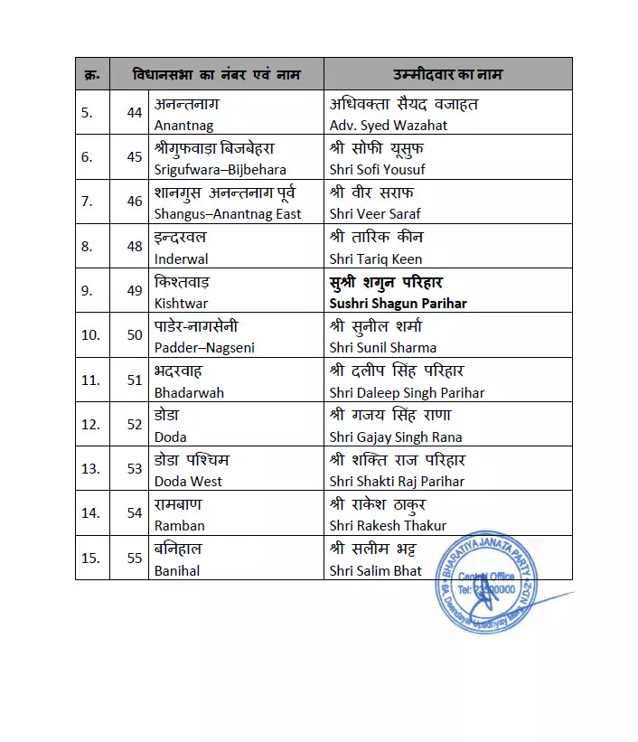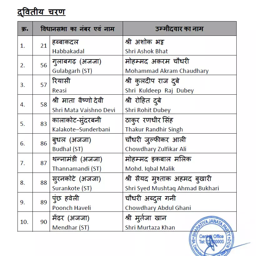 भाजपा ने जारी की जम्मू-कश्मीर विधानसभा चुनाव के लिए 44 उम्मीदवारों की सूची