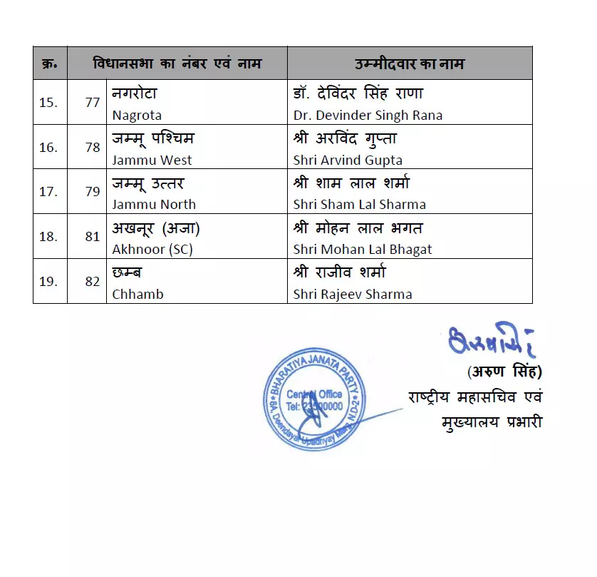 वहीं तीसरे चरण के लिए जारी सूची के अनुसार, पवन गुप्ता उधमपुर पश्चिम से, डॉ. देविंदर कुमार मनियाल रामगढ़ (एससी) से और मोहन लाल भगत अखनूर से चुनाव लड़ेंगे