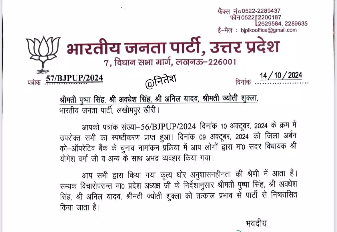 |लखीमपुर खीरी, उत्तरप्रदेश। MLA योगेश वर्मा थप्पड़ कांड के 5 दिन बाद भाजपा ने एक्शन लिया है। अधिवक्ता अवधेश सिंह, उनकी पत्नी पुष्पा सिंह, अनिल यादव व ज्योति शुक्ला को भाजपा ने पार्टी से बाहर का रास्ता दिखाया है। विधायक थप्पड़ कांड में 5 दिन बाद पार्टी ने अनुशासन हीनता का हवाला देते हुए की बड़ी कारवाई की है।