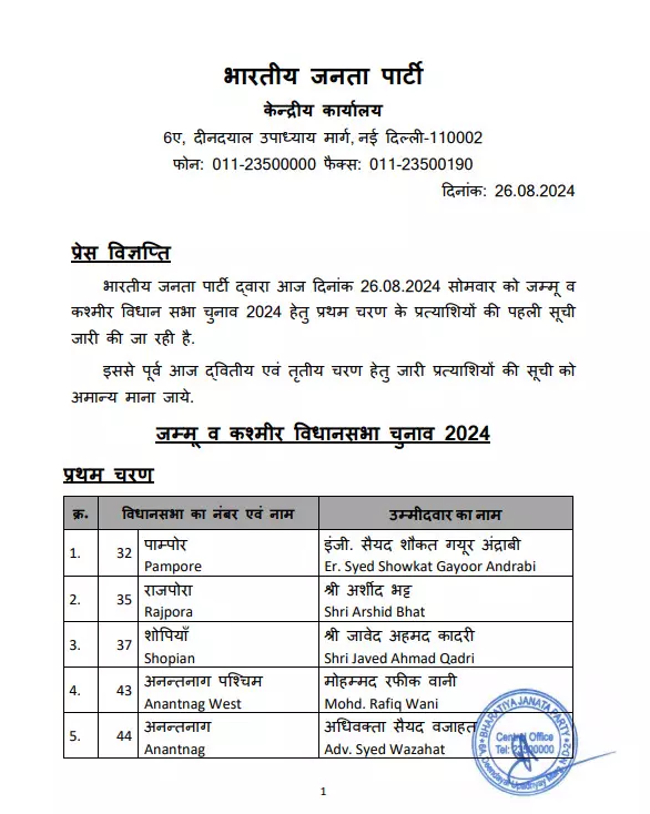 जम्मू कश्मीर में विधानसभा चुनाव तीन चरणों में होगा। इसके लिए भाजपा ने सुबह तीन सूची जारी की थी। प्रथम चरण के लिए 15, दूसरे चरण के लिए 10 और तीसरे चरण के लिए 19 उम्मीदवारों के नाम इस सूची में थे। अब भाजपा ने नई सूची जारी करते हुए प्रथम सूची को ही मान्य बताया है।