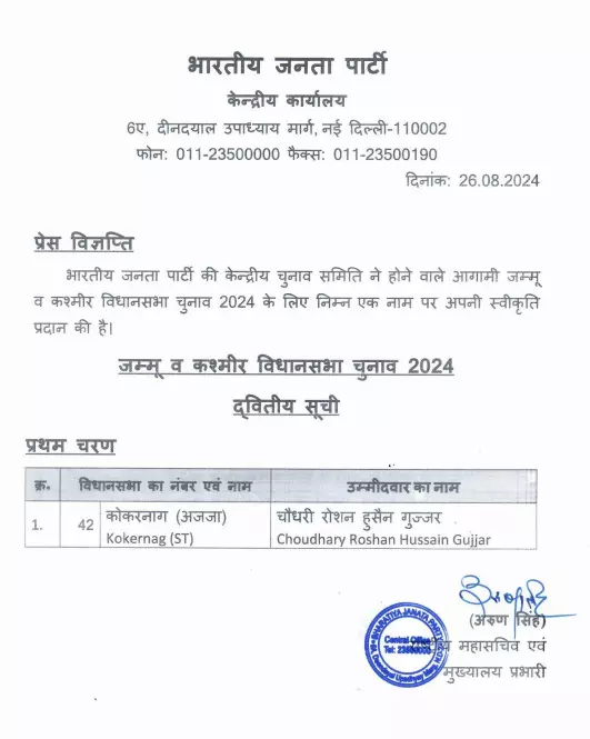 भाजपा ने सोमवार दोपहर 2.30 पर आगामी जम्मू-कश्मीर विधानसभा चुनाव के लिए एक उम्मीदवार की दूसरी सूची भी जारी कर दी। इस सूची में एक उम्मीदवार का नाम है। इसके अनुसार चौधरी रोशन हुसैन गुज्जर कोंकरनाग से चुनाव लड़ेंगे।