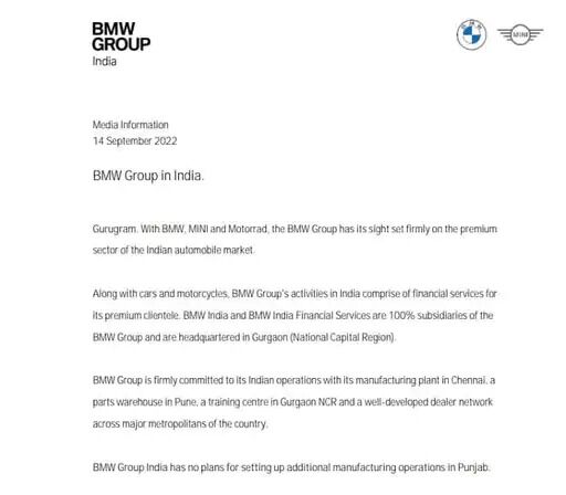मान के इस दावे के बाद आज बीएमडब्ल्यू ने बयान देकर मामले को झूठ करार दे दिया। कंपनी ने अपने आधिकारिक बयान में कहा की बीएमडब्ल्यू ग्रुप इंडिया की पंजाब में अलग से मैनुफैक्चरिंग ऑपरेशन स्थापित करने की कोई योजना नहीं है। बयान में कहा गया है कि कारों और मोटरसाइकिलों के साथ, भारत में बीएमडब्ल्यू समूह की गतिविधियों में इसके प्रीमियम ग्राहकों के लिए वित्तीय सेवाएं शामिल हैं। बीएमडब्ल्यू ग्रुप अपने भारतीय ऑपरेशन के लिए प्रतिबद्ध है जिसमें चेन्नई में विनिर्माण संयंत्र, पुणे में एक पुर्जे का गोदाम, गुड़गांव-एनसीआर में एक प्रशिक्षण केंद्र और देश के प्रमुख महानगरों में डीलरों का एक नेटवर्क शामिल है। बीएमडब्ल्यू इंडिया और बीएमडब्ल्यू इंडिया फाइनेंशियल सर्विसेज समूह की 100 प्रतिशत सहायक कंपनियां हैं और इसका मुख्यालय गुड़गांव (राष्ट्रीय राजधानी क्षेत्र) में है।कंपनी के बयान के बाद पंजाब सरकार और मुख्यमंत्री मान की ओर से कोई आधकारिक प्रतिक्रिया नहीं आई है। .