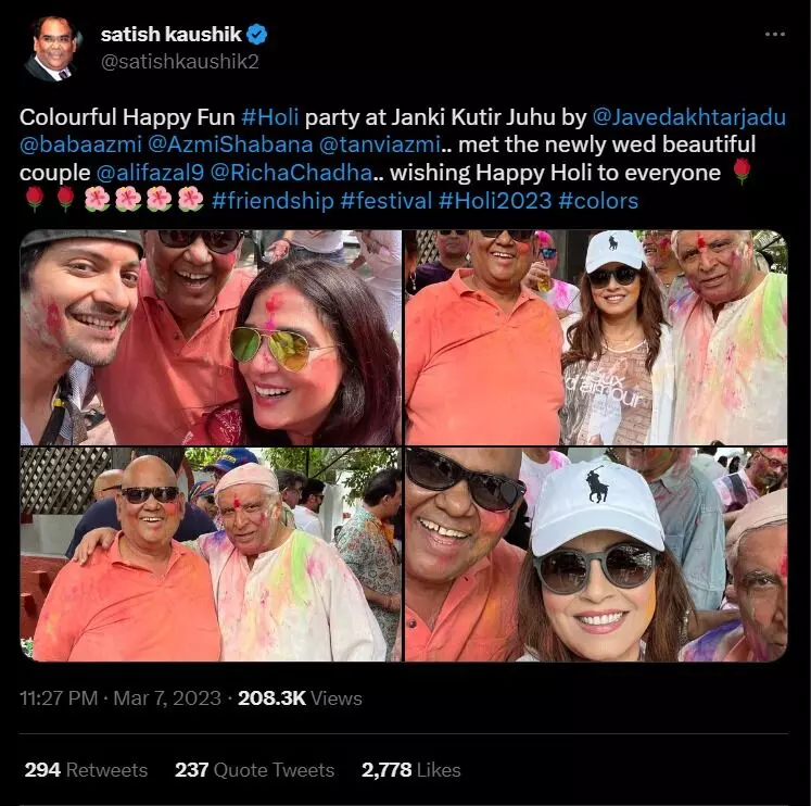 |होली के दिन मशहूर गीतकार जावेद अख्तर ने जुहू में एक होली पार्टी का आयोजन किया। सतीश कौशिक इस कार्यक्रम में शामिल हुए।
