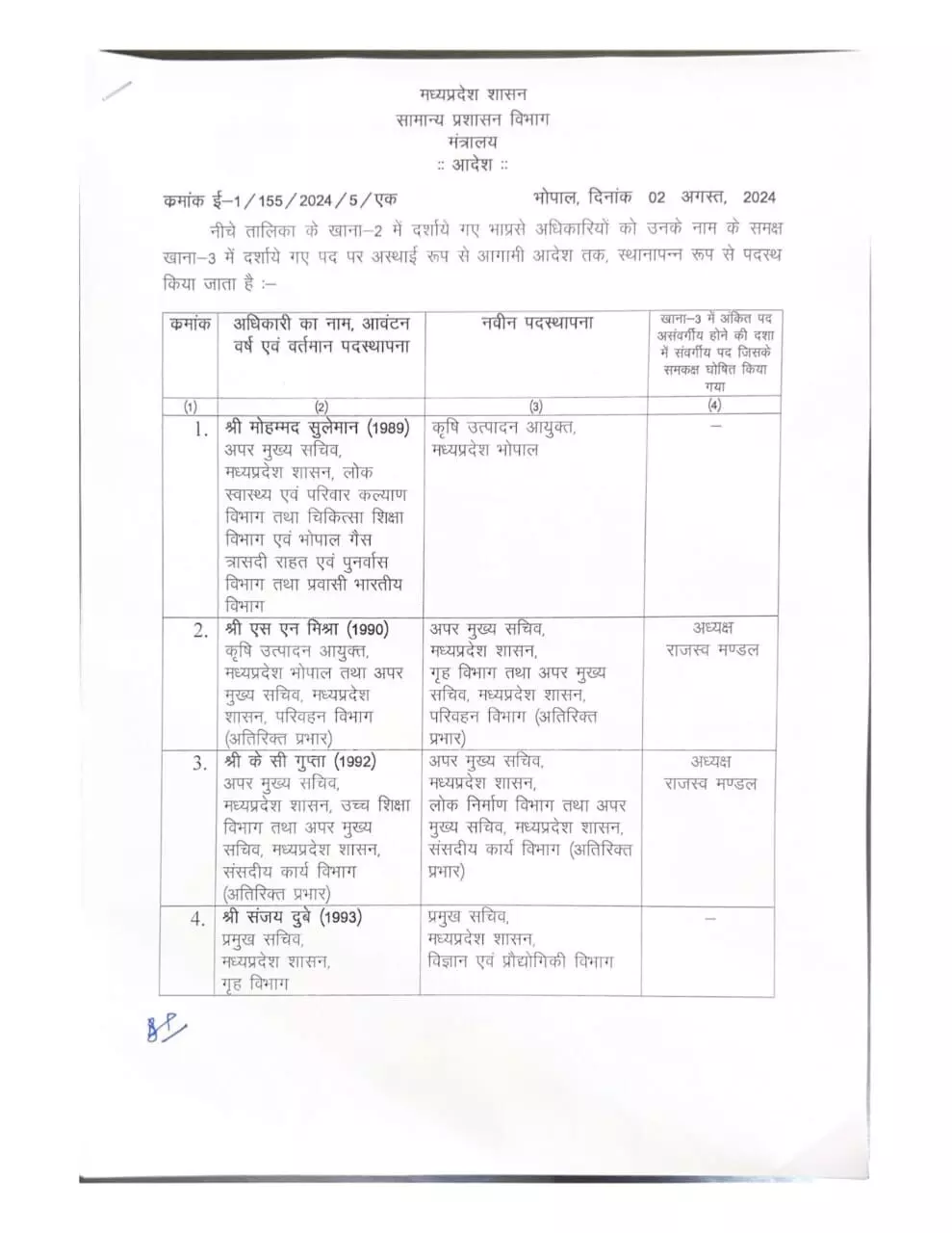MP IAS Transfer : भोपाल। मध्यप्रदेश में 10 आईएएस अधिकारियों का तबादला कर दिया गया है। इसके लिए आदेश जारी कर दिए गए हैं। आदेश के अनुसार 1989 बैच के आईएएस अधिकारी मोहम्मद सुलेमान को स्वास्थ और परिवार कल्याण विभाग के अपर मुख्य सचिव के पद से हटाकर कृषि उत्पादन आयुक्त बना दिया गया है। वहीं 1990 बैच के आईएएस अधिकारी एसएन मिश्रा को कृषि उत्पादन आयुक्त के स्थान पर परिवहन और गृह विभाग का अपर मुख्य सचिव बना दिया गया है।