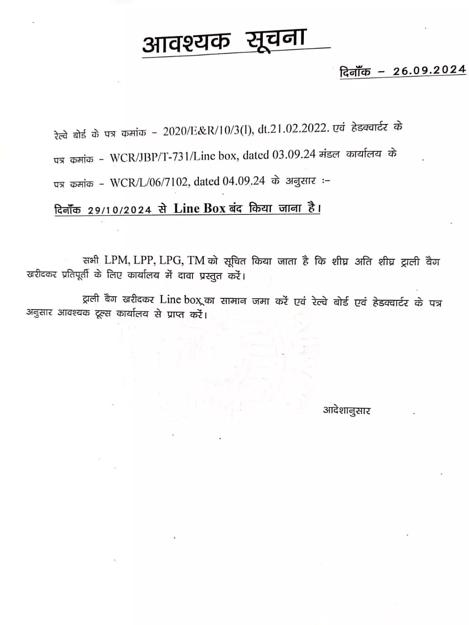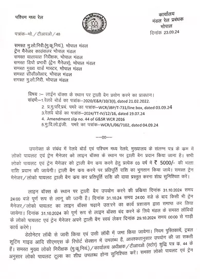 रेलवे द्वारा आदेश जारी कर कहा गया है कि, 29 सितंबर को ब्लैक बॉक्स बंद किया जाना है। इसके लिए LPM, LPP, LGP और TM को सूचित किया जाता है कि, जल्द से जल्द ट्रॉली बैग खरीदकर प्रतिपूर्ति के लिए ऑफिस में दावा पेश करें। ट्रॉली बैग खरीदकर लाइन बॉक्स (ब्लैक बॉक्स) का सामान जमा करें और रेलवे कार्यालय के पत्र के अनुसार आवश्यक टूल प्राप्त करें।