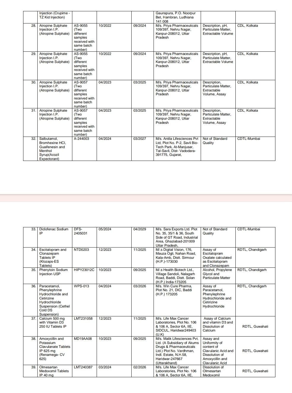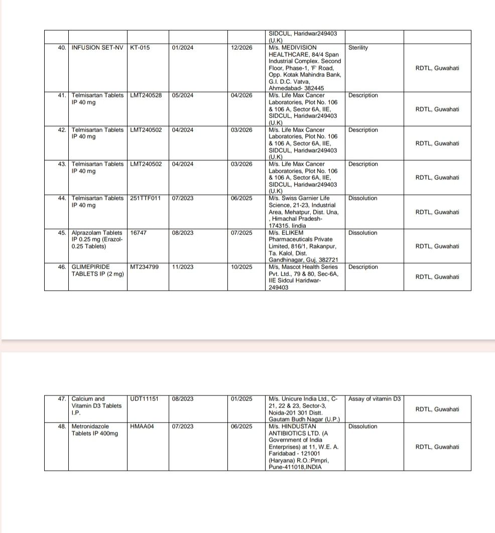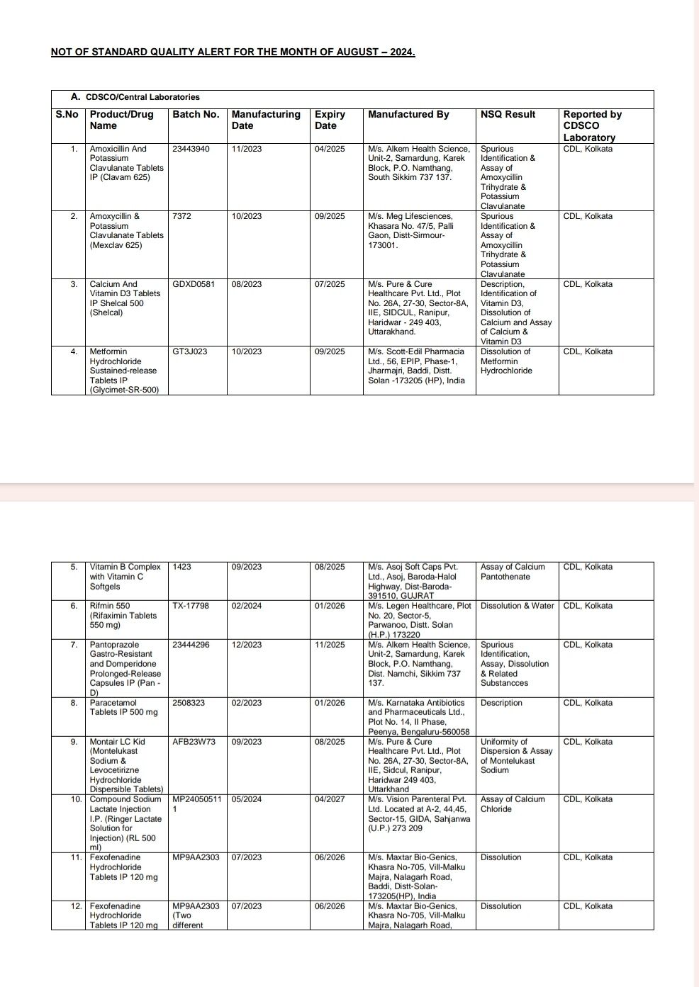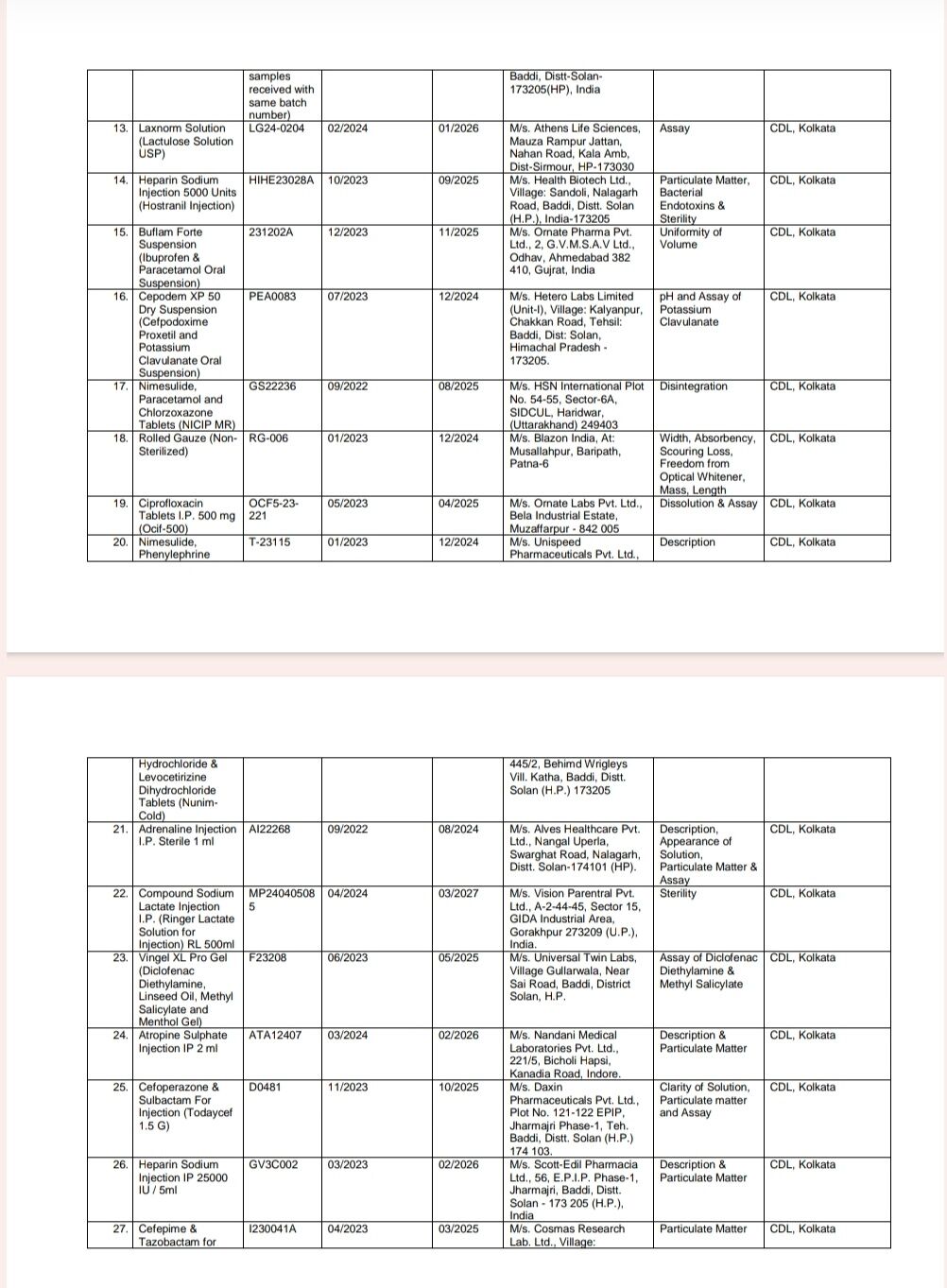 क्वालिटी चेक मेंं फेल होने वाली दवाओं में विटामिन सी और डी3 टैबलेट, शेल्कल, विटामिन बी कॉम्प्लेक्स, विटामिन सी सॉफ्टजेल, एंटी-एसिड पैन-डी, पैरासिटामोल टैबलेट (आईपी 500 मिलीग्राम), एंटी-डायबिटिक दवा ग्लिमेपिराइड और ब्लड प्रेशन की दवा टेल्मिसर्टन शामिल हैं।